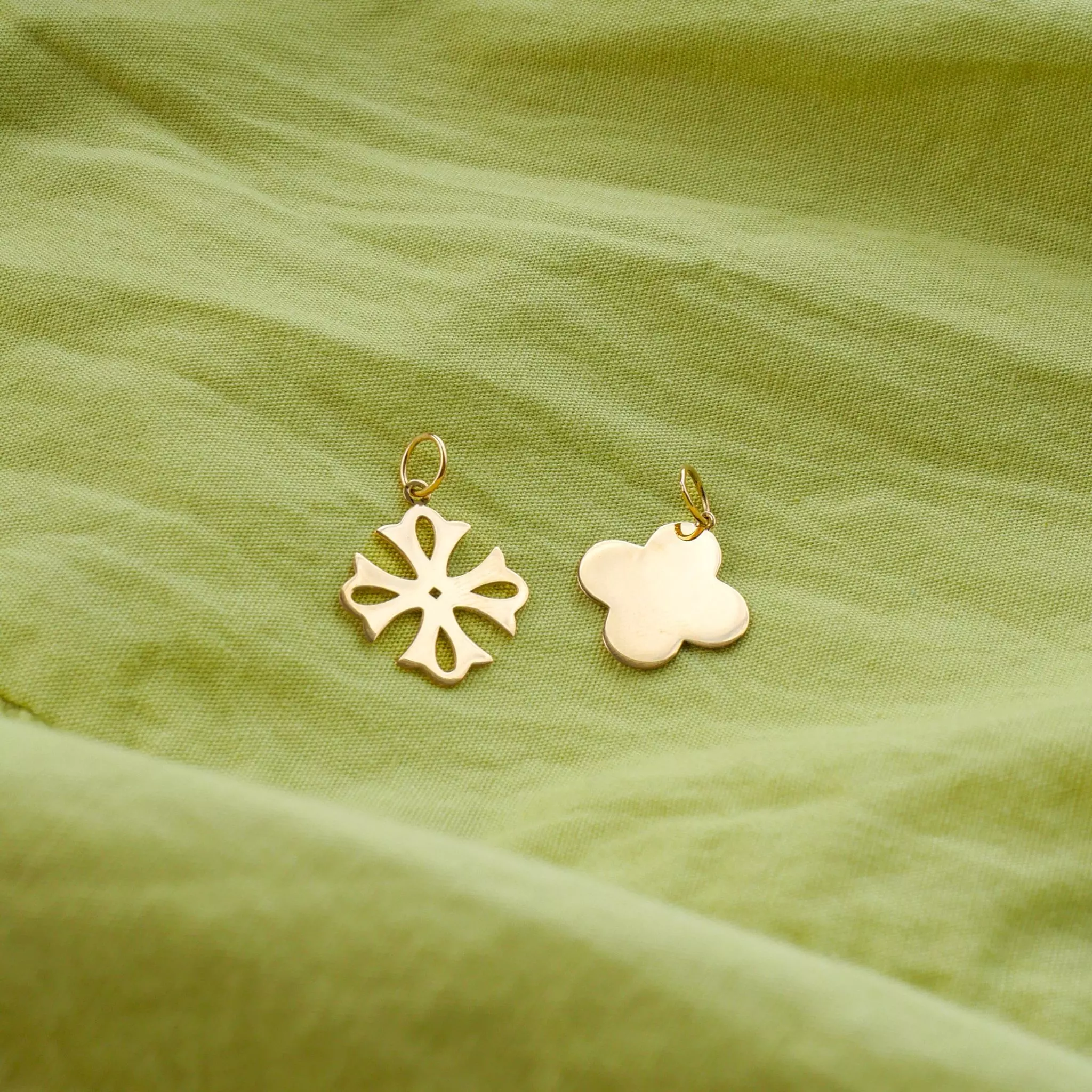 Cette croix reprend la forme de la croix romane, largement représentée dans l’architecture et les arts du Moyen Âge. Ses extrémités arrondies évoquent à la fois le trèfle et le symbole religieux, donnant à ce bijou une double lecture : un signe de foi chrétienne mais aussi un motif doux et ornemental.
