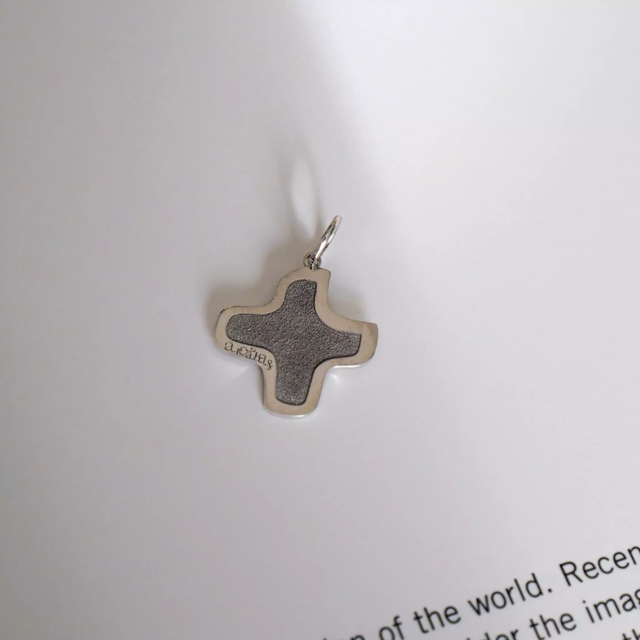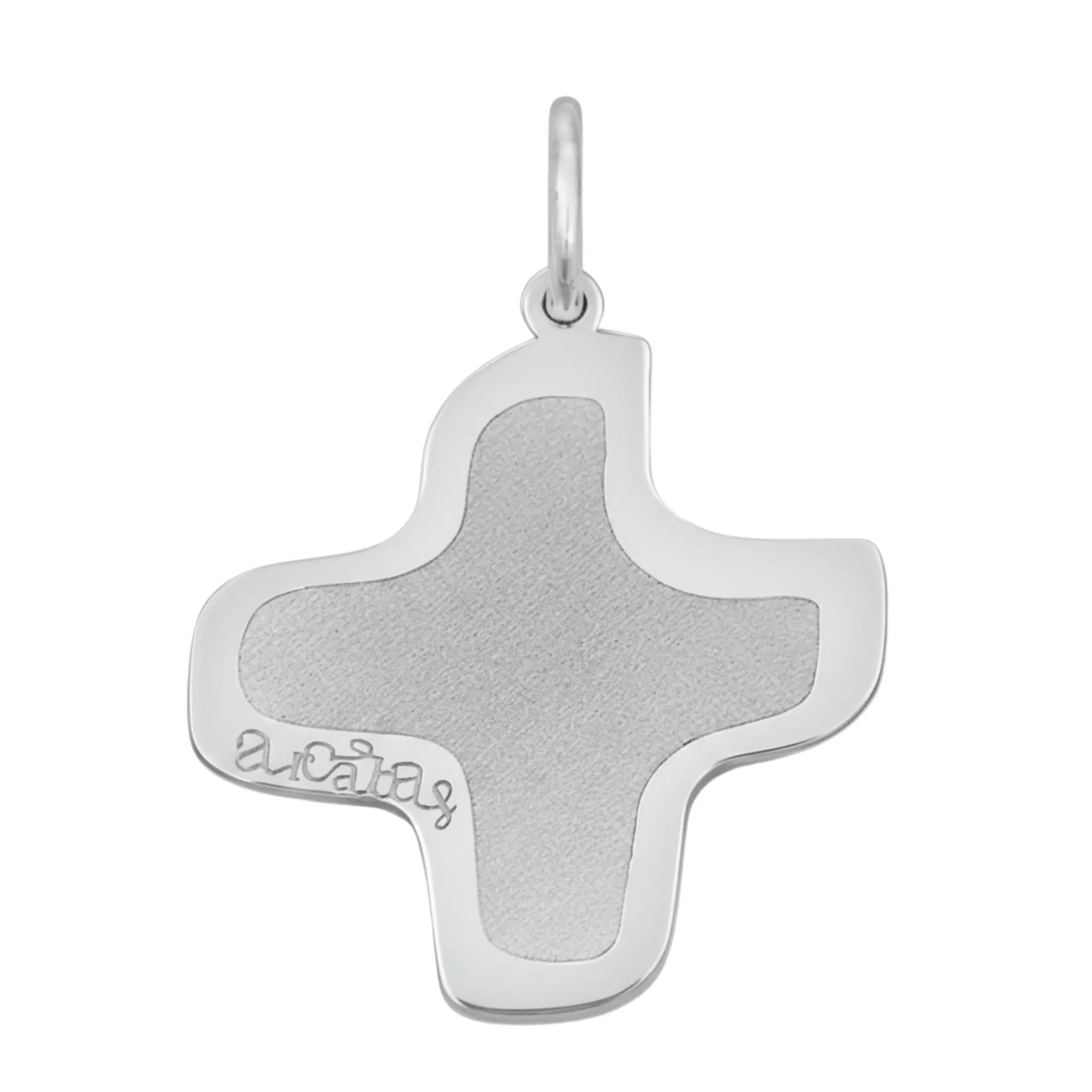 Cette croix Arcabas en or blanc se distingue par son jeu subtil de contrastes, avec un cœur sablé mat qui évoque la sobriété et la pureté, et un contour poli brillant qui apporte éclat et relief. La signature authentique d’Arcabas apposée au recto en fait une pièce unique, à la frontière entre art et bijouterie.