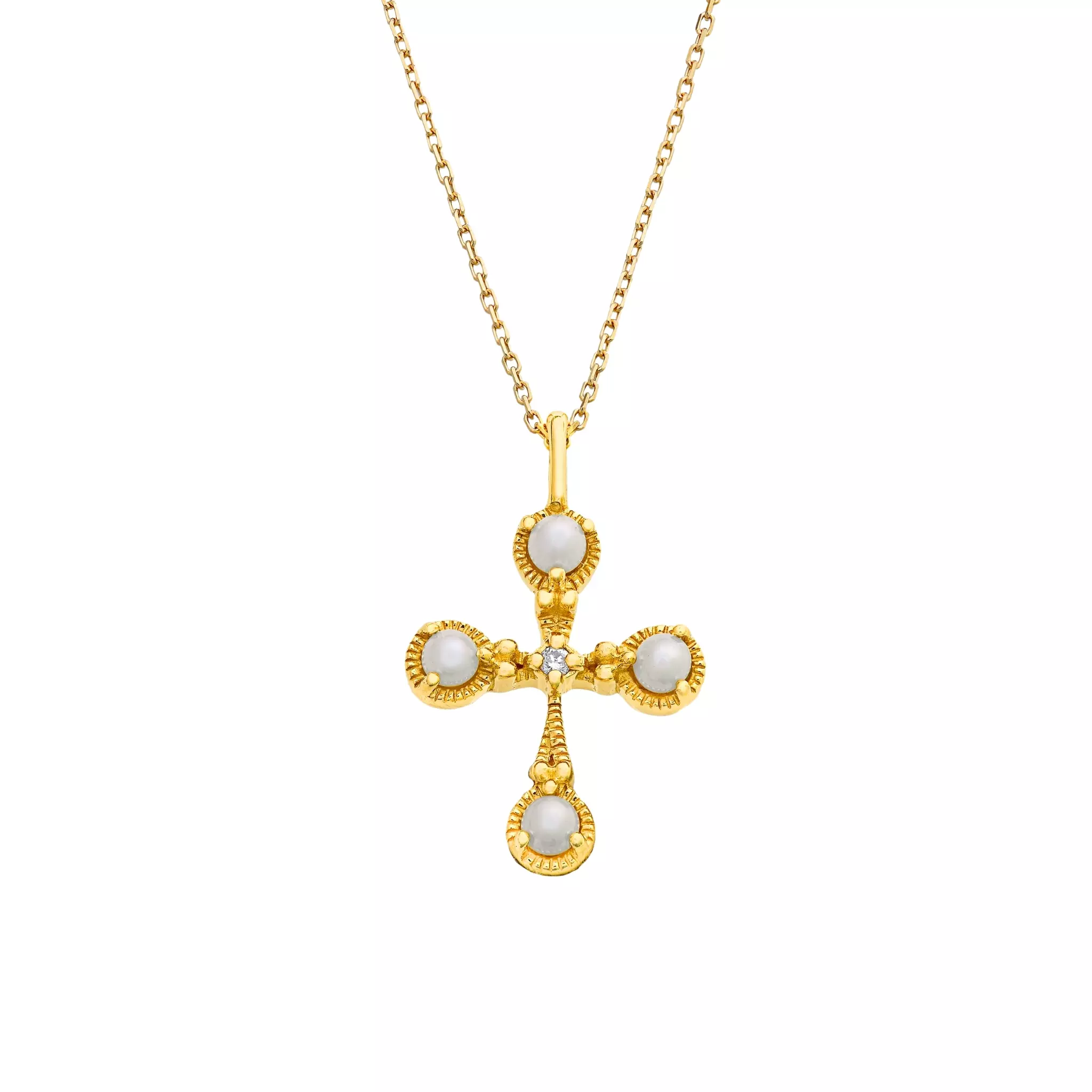 Joli collier avec une croix finement travaillée de 4 perles et un diamant.