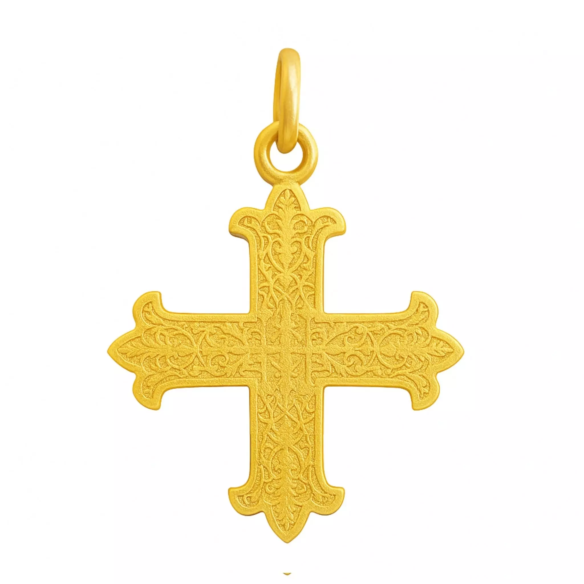 Découvrez cette magnifique croix de Saint Irénée, un bijou spirituel aux détails finement travaillés. Réalisée en or jaune, elle présente un décor délicatement ciselé qui met en valeur toute la richesse de l’art religieux. Sa forme élancée, ornée de motifs élégants, en fait une pièce à la fois intemporelle et précieuse, parfaite comme cadeau de baptême, de communion ou de confirmation. Grâce à son anneau discret et solide, cette croix pourra être portée au quotidien ou lors de cérémonies, en signe de foi et de protection.