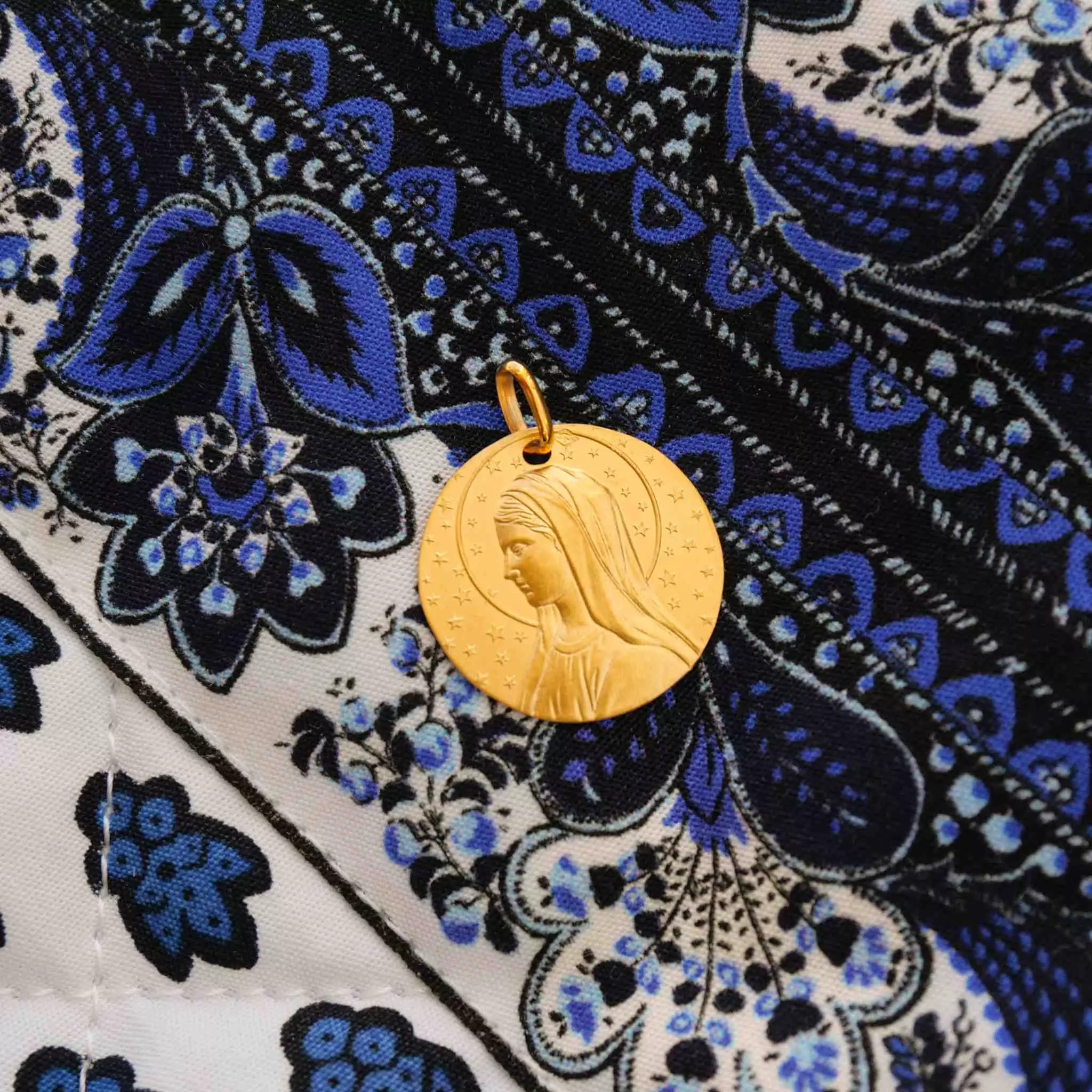 La Médaille Régina Caeli en or jaune 18 carats est une création exclusive de la Maison La Couronne. D’un diamètre classique de 18 mm et d'un poids important de 2,8 grammes, elle représente la Vierge Marie de profil, auréolée et entourée d’étoiles, rappelant son titre de Reine du ciel. Sa finition satinée joue subtilement entre mat et brillant, donnant à la médaille une élégance intemporelle.