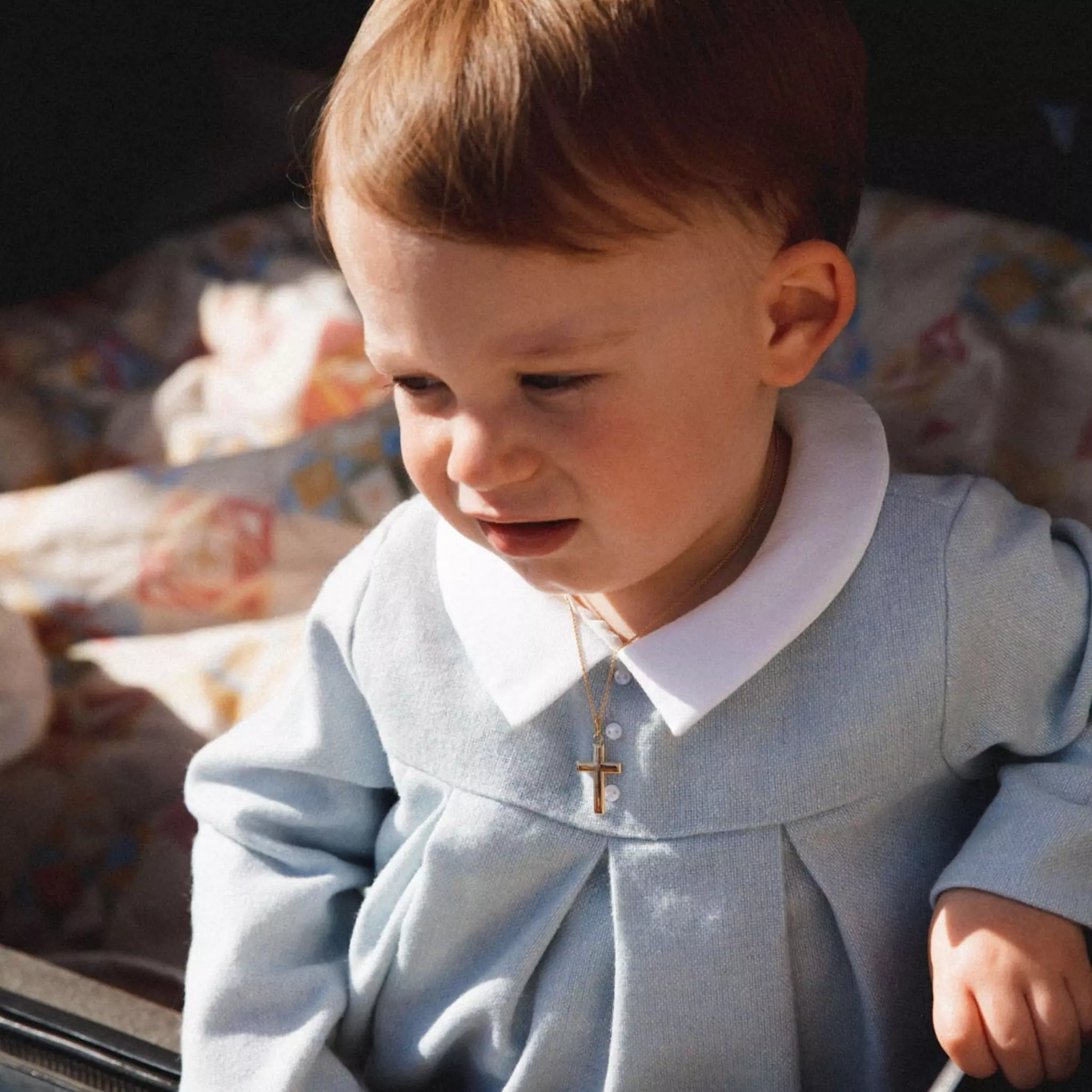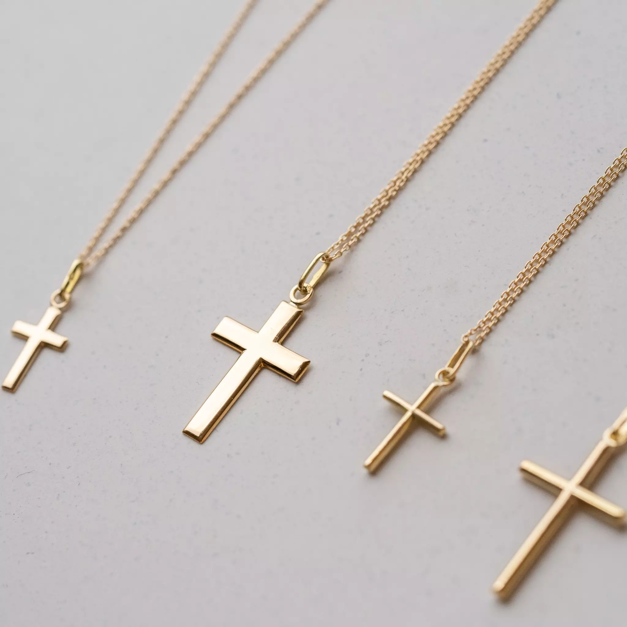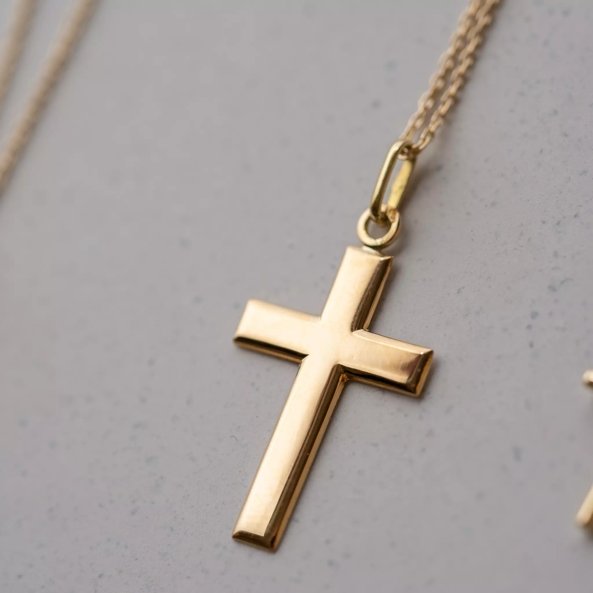 Cette grande croix est plate et à des bords chanfreinés, en or jaune 18 carats elle fait beaucoup d'effets.