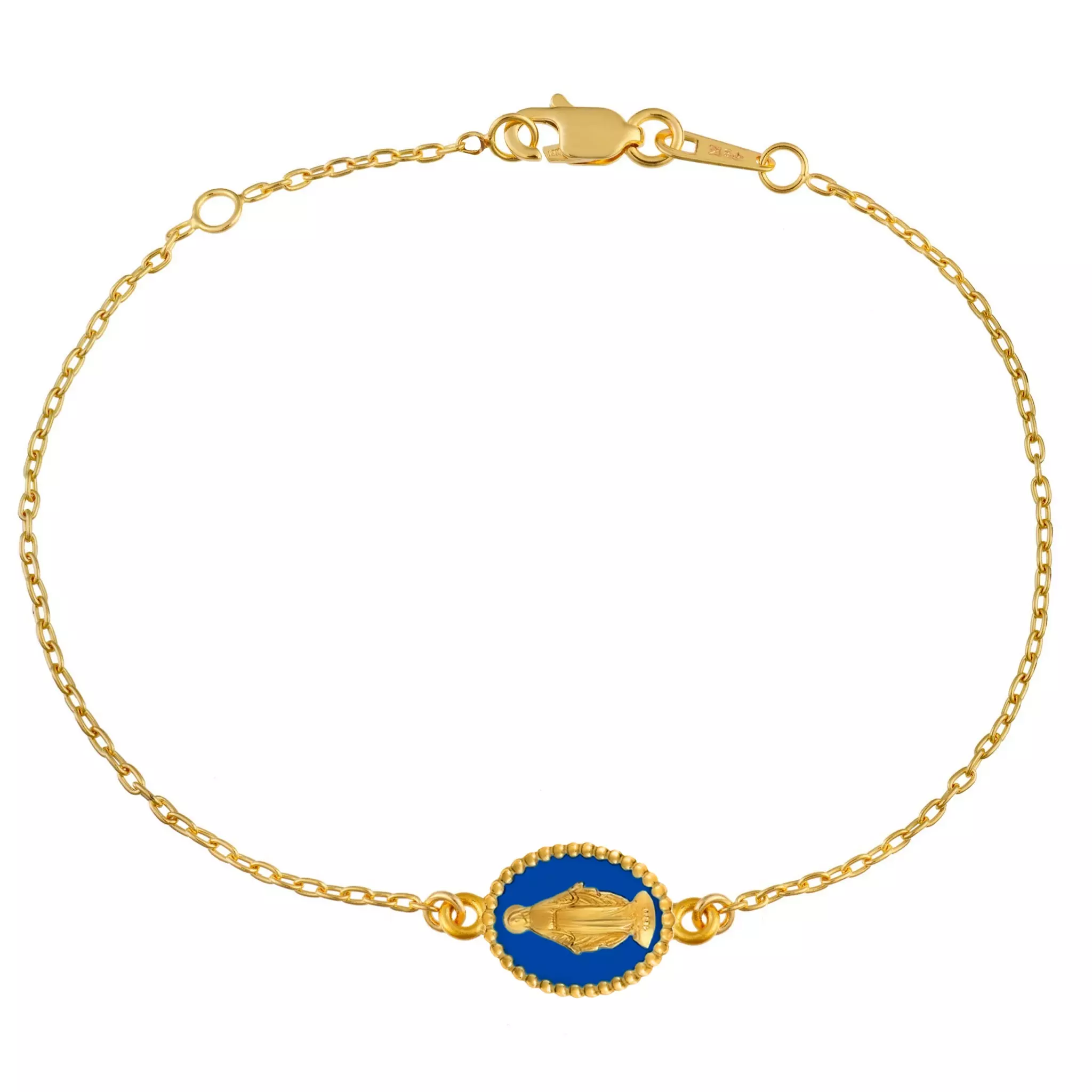 Montrez votre foi en toute élégance et discrétion avec ce beau bracelet d'une longueur de 16cm. La médaille Miraculeuse mesure 10mm de hauteur, elle est recto verso, son bord est perlé lui donne un coté très féminin et elle est de couleur bleu roi.