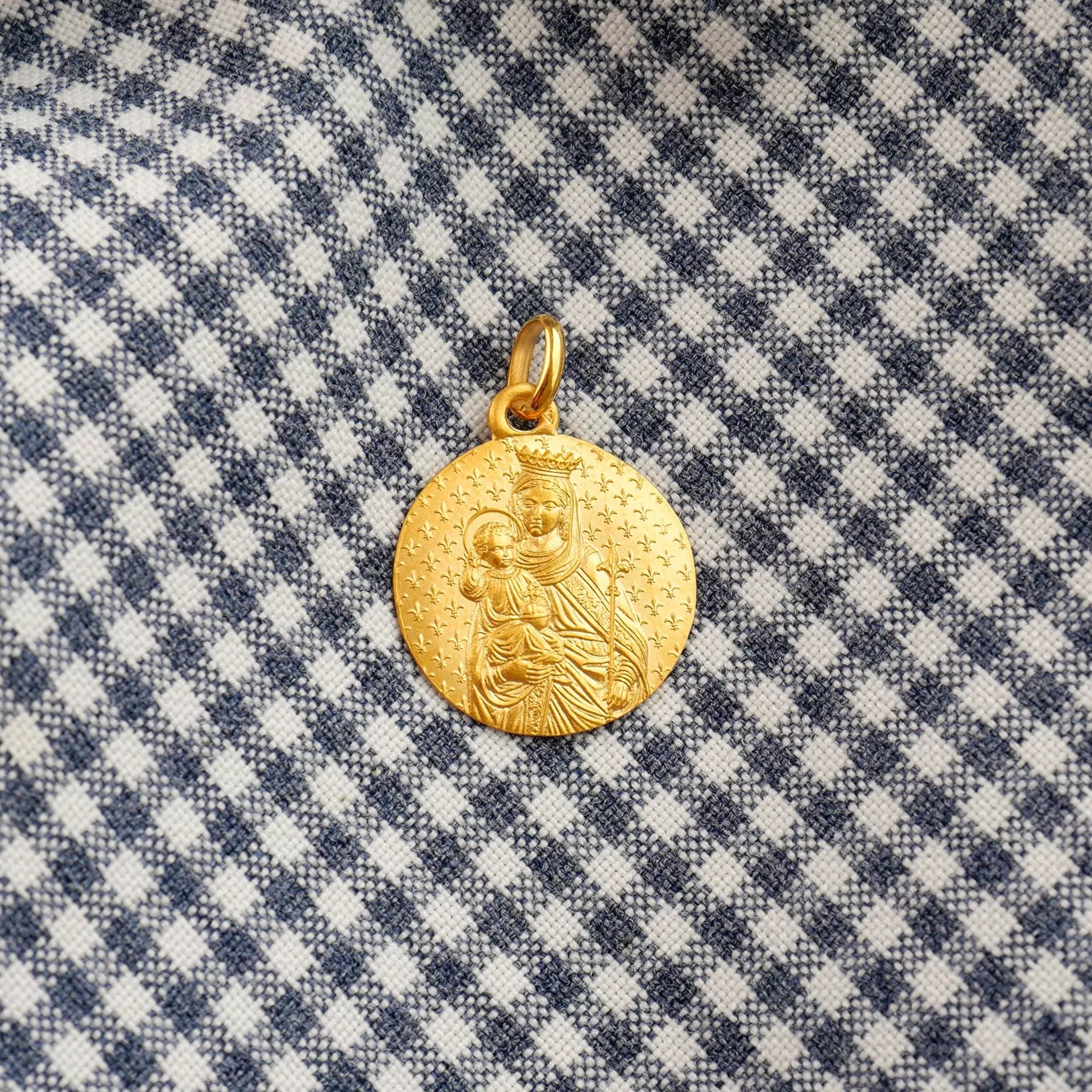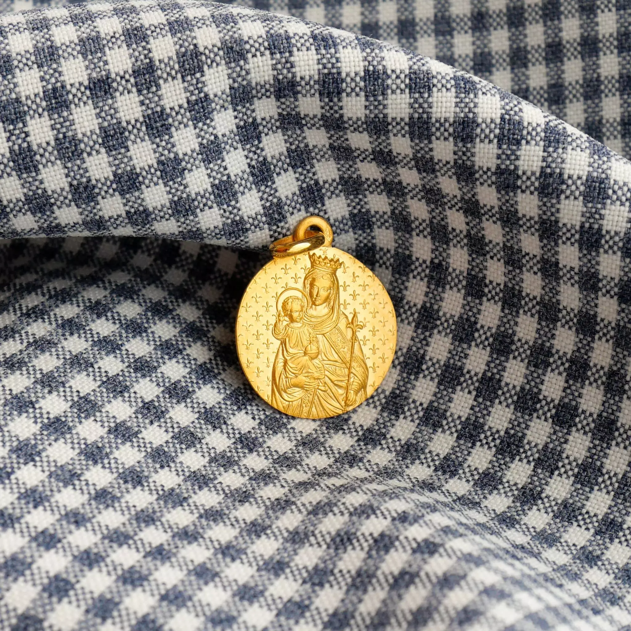 Cette médaille de baptême est une représentation de Notre Dame de France. Sur cette médaille, de nombreux détails sont présentés, la Sainte Vierge couronnée porte l'enfant Jésus et tient dans sa main une tige de lys, symbole de sa pureté et de sa chasteté. L'enfant Jésus a dans sa main le globe terrestre. Sur le fond de la médaille, des fleurs de Lys sont représentées et polies.