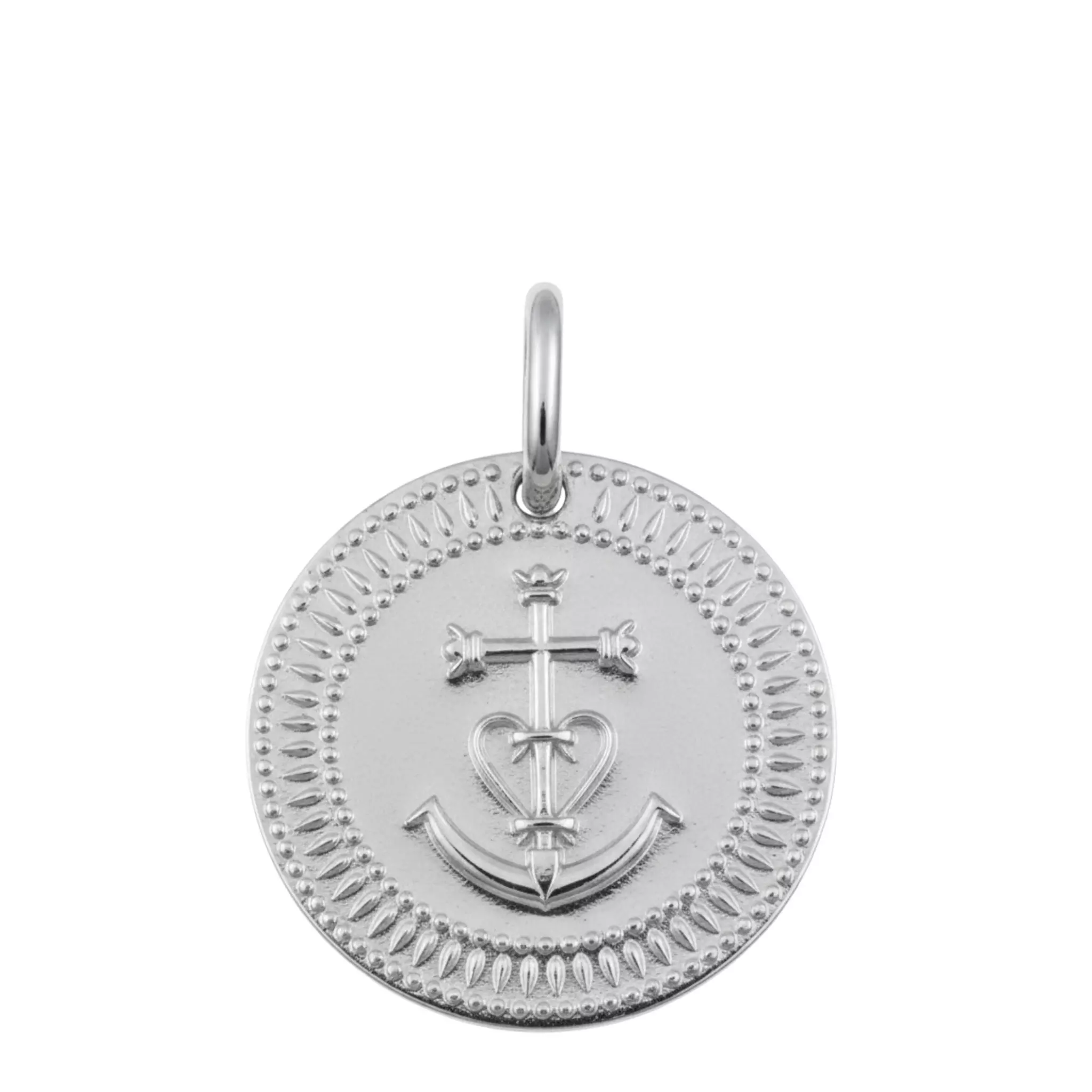 De forme galet, cette médaille de baptême en argent d'un diamètre de 16mm représente la Croix Camarguaise. Cette belle médaille est une création exclusive signée Maison la Couronne.