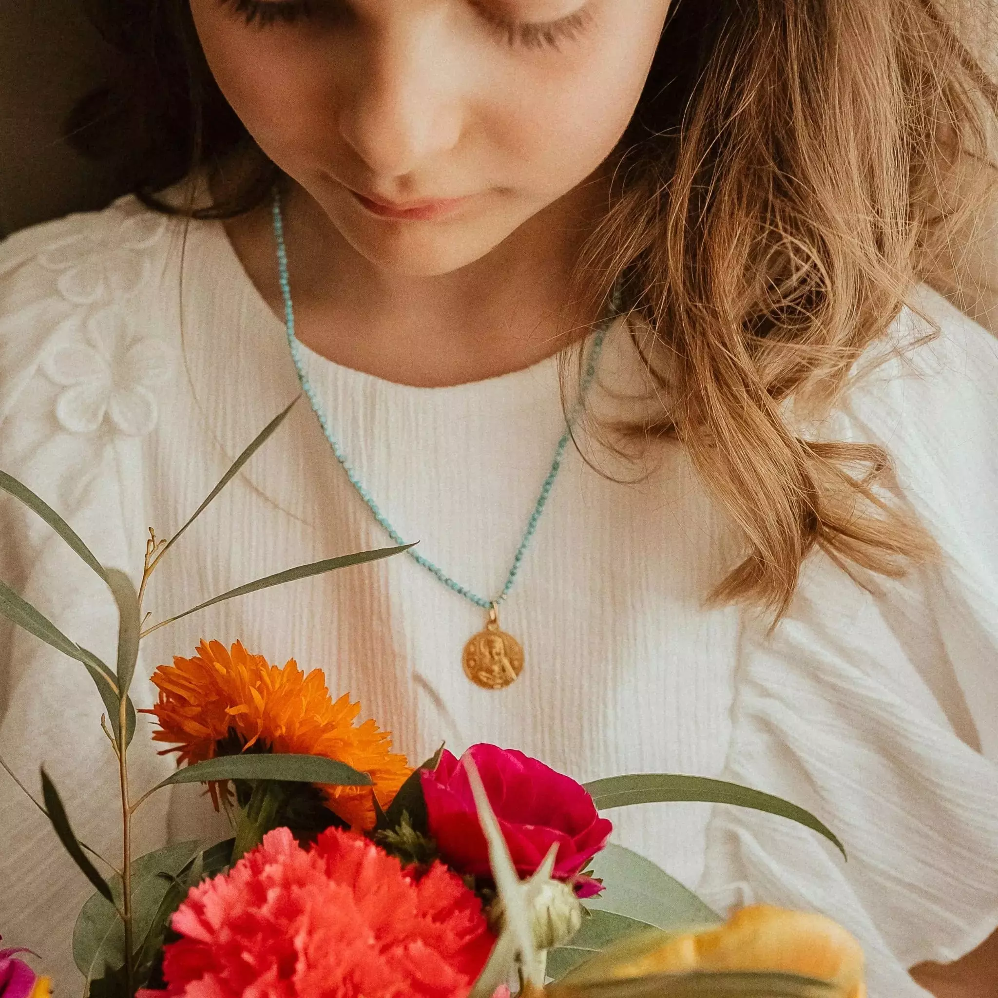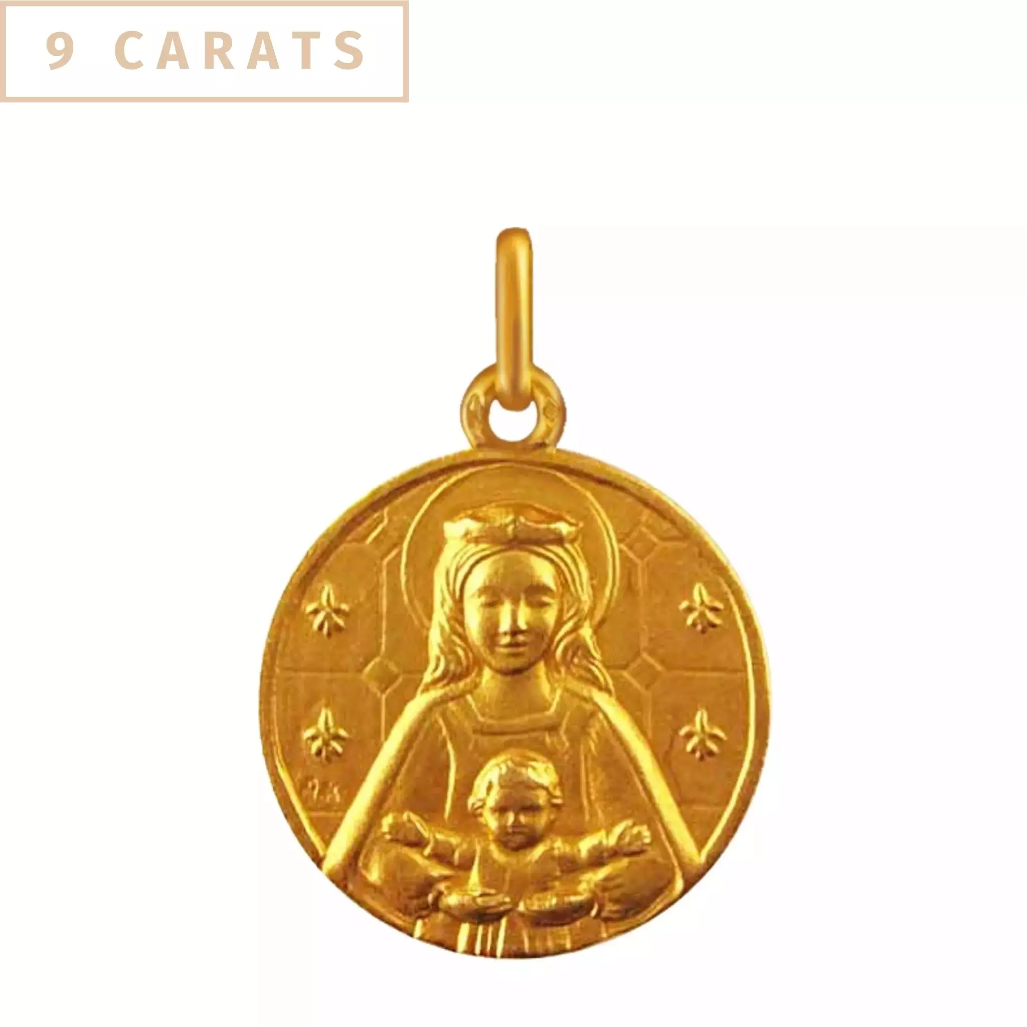 Médaille de baptême dans le style de l’art roman représentant la Vierge Marie de face couronnée et souriante, tenant sur ses genoux Jésus petit enfant les bras ouverts au monde.