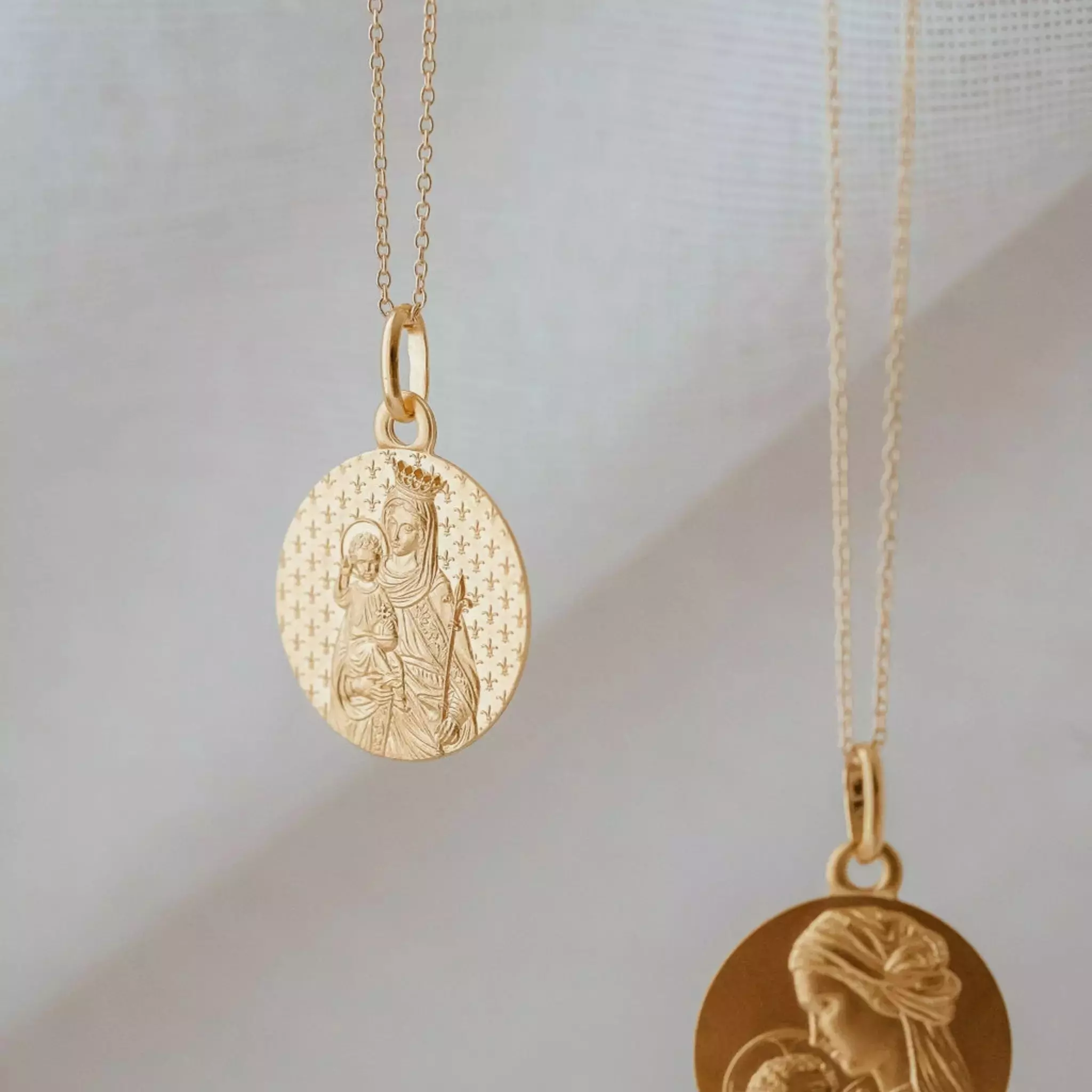 Cette médaille de baptême est une représentation de Notre Dame de France. Sur cette médaille, de nombreux détails sont présentés, la Sainte Vierge couronnée porte l'enfant Jésus et tient dans sa main une tige de lys, symbole de sa pureté et de sa chasteté. L'enfant Jésus a dans sa main le globe terrestre. Sur le fond de la médaille, des fleurs de Lys sont représentées et polies.