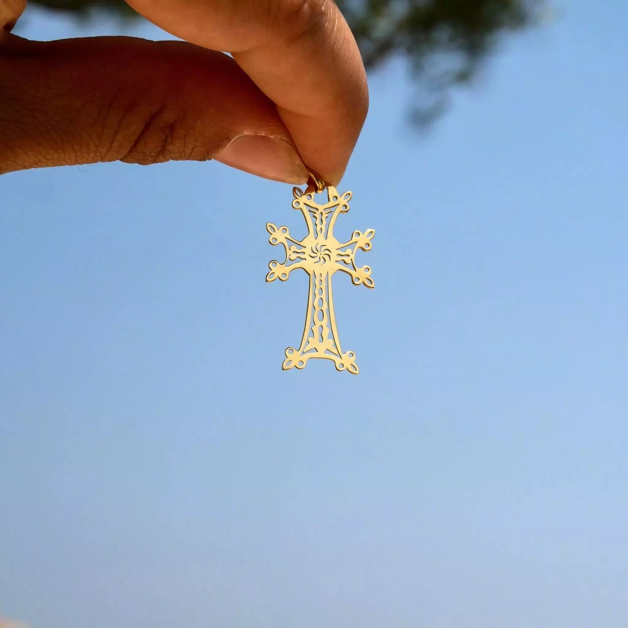 Inspirée des khachkars, croix sculptées emblématiques du patrimoine arménien, elle dévoile un design ajouré délicat, orné de motifs fleuronnés à chaque extrémité.
