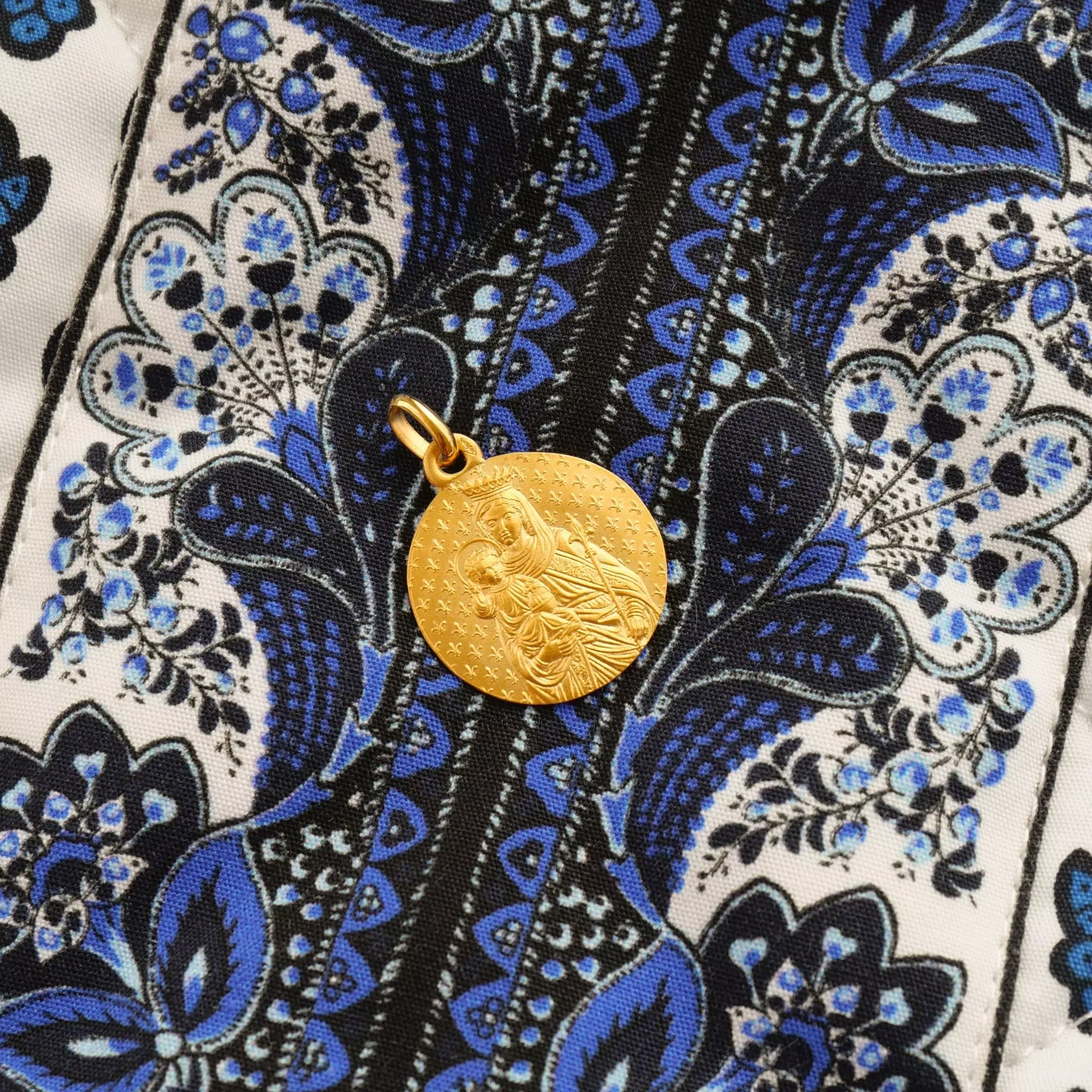 Cette médaille de baptême est une représentation de Notre Dame de France. Sur cette médaille, de nombreux détails sont présentés, la Sainte Vierge couronnée porte l'enfant Jésus et tient dans sa main une tige de lys, symbole de sa pureté et de sa chasteté. L'enfant Jésus a dans sa main le globe terrestre. Sur le fond de la médaille, des fleurs de Lys sont représentées et polies.