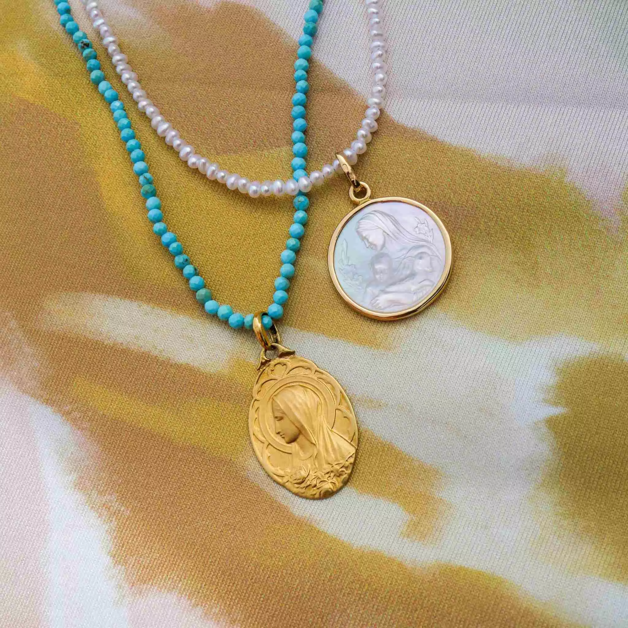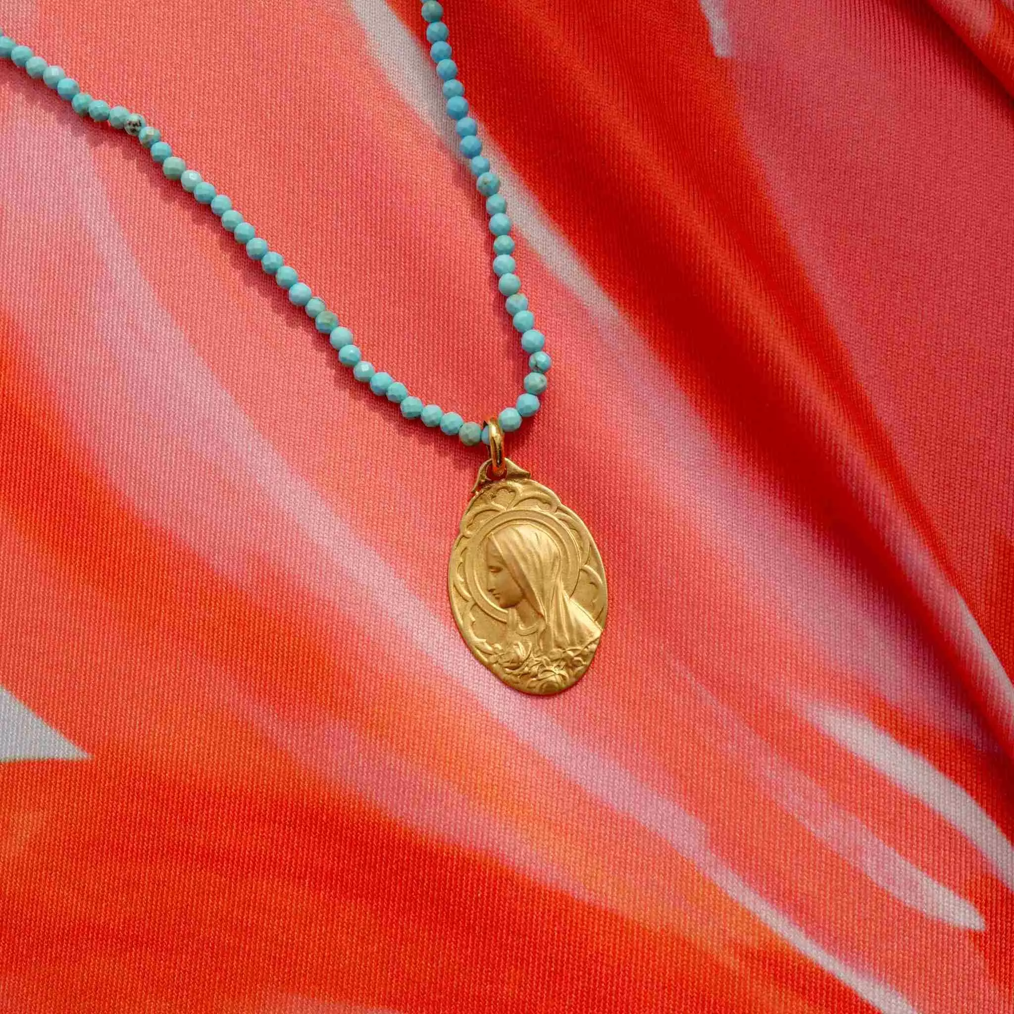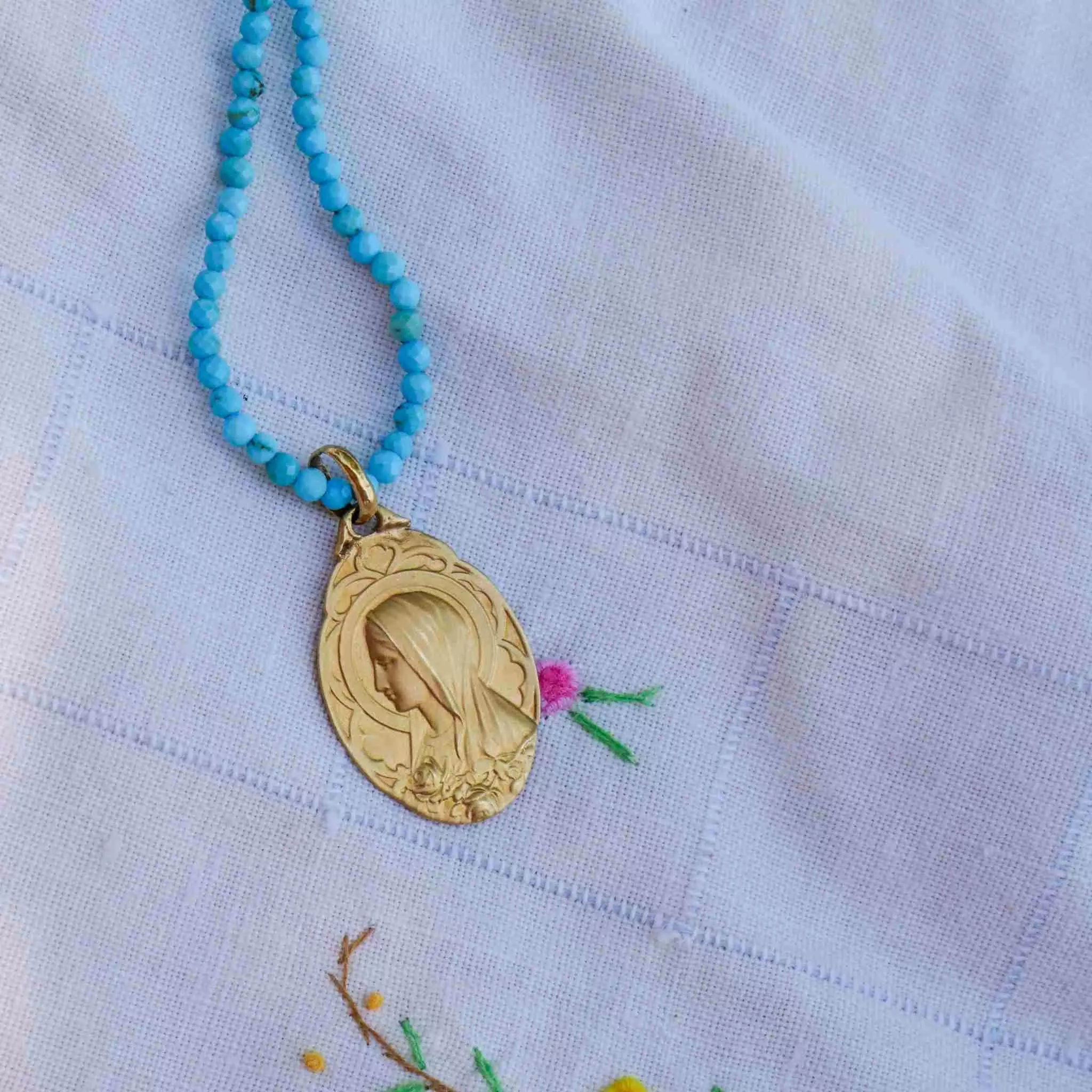 Belle médaille de baptême de forme ovale avec la Vierge Marie de profil avec un beau décor floral en fond.