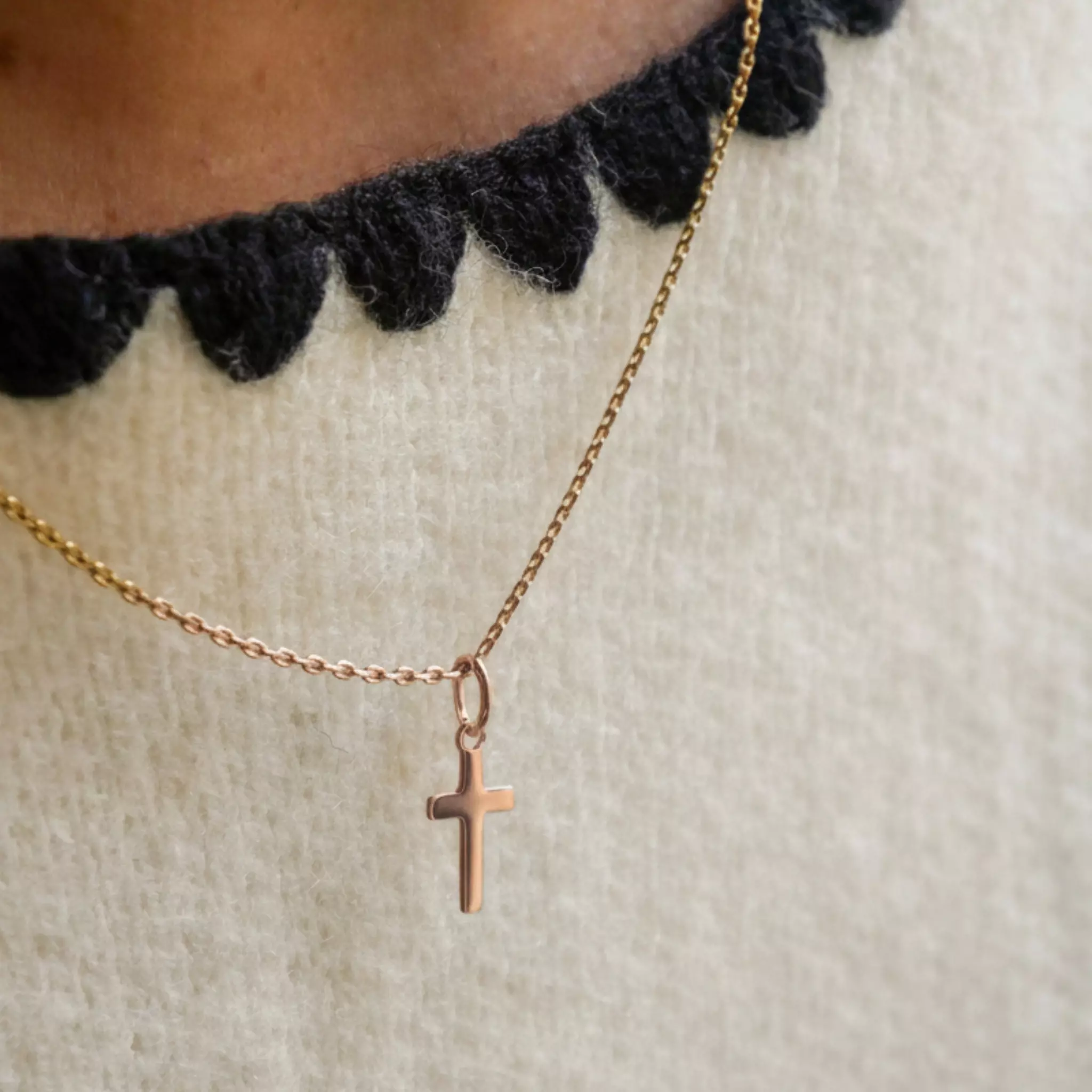 Cette petite croix en or rose 18 carats (750/1000) associe douceur et délicatesse.