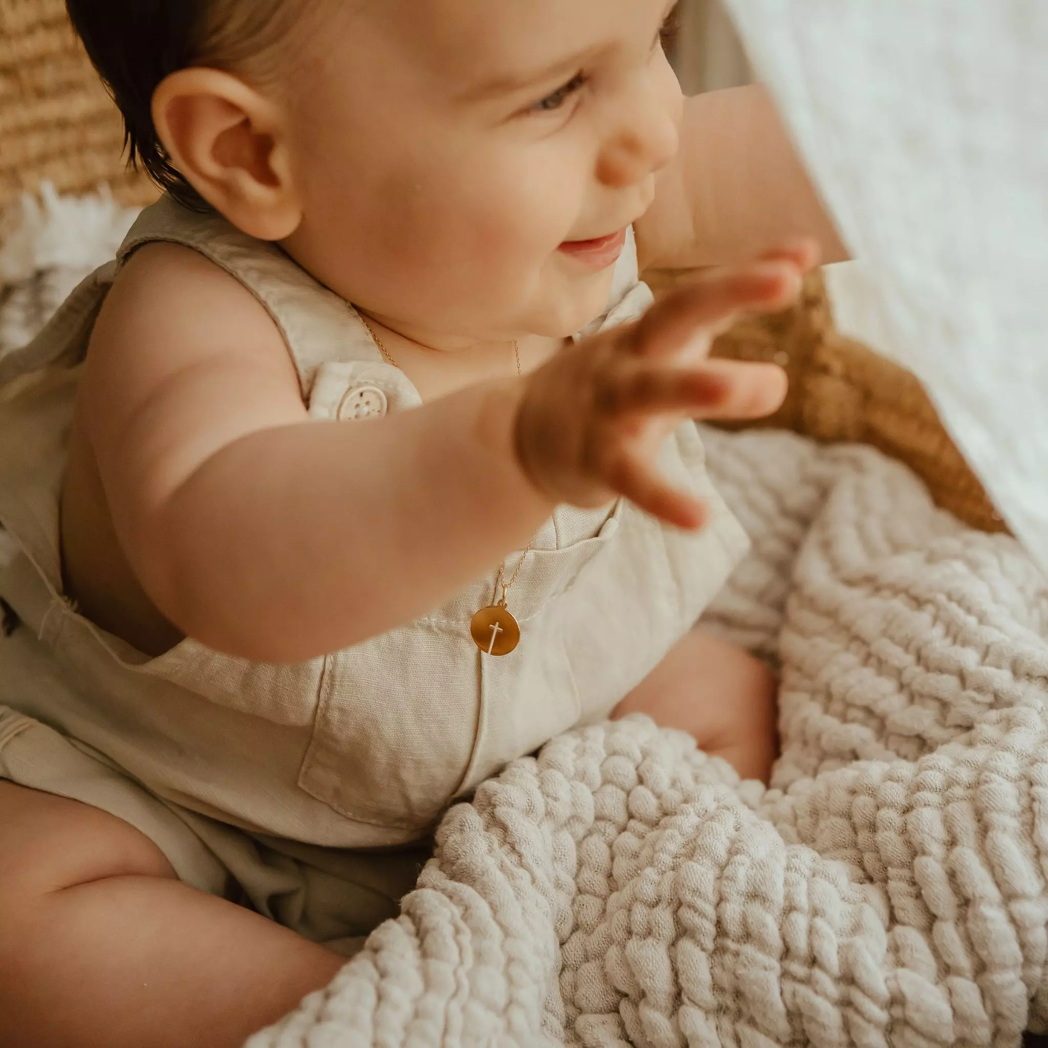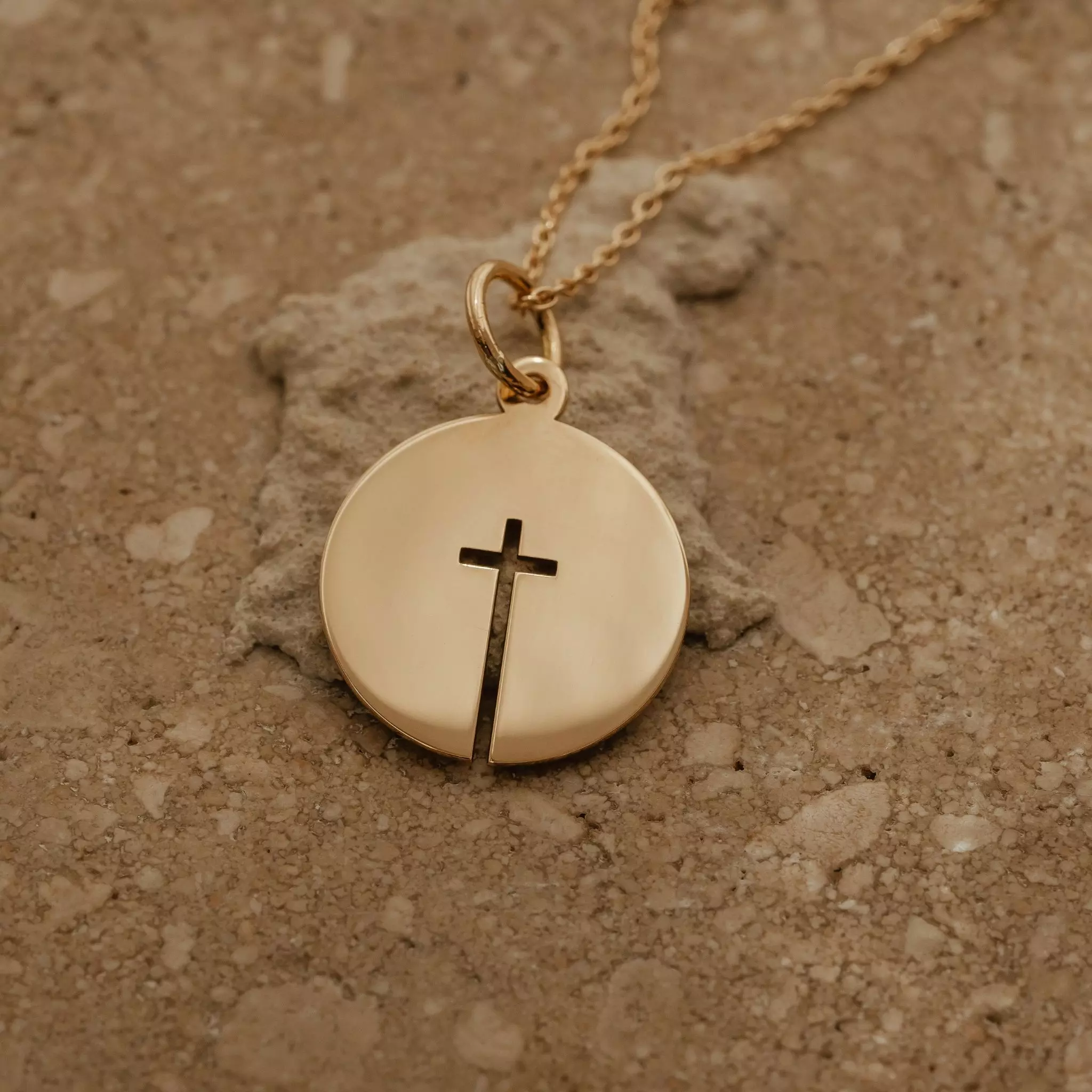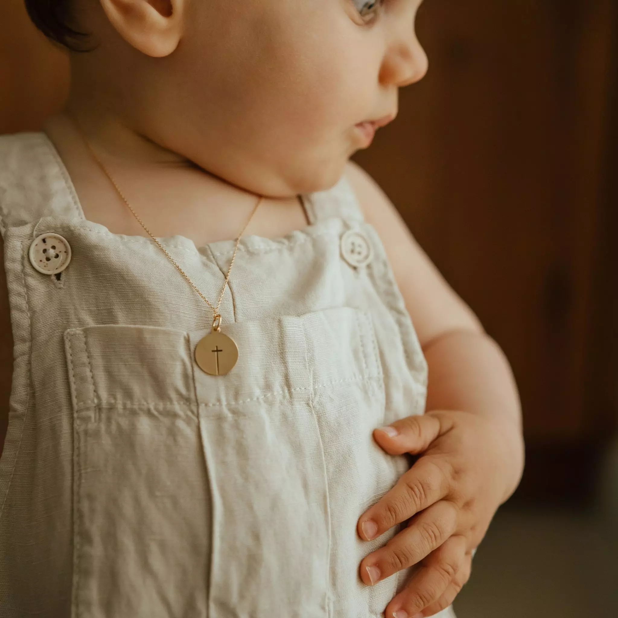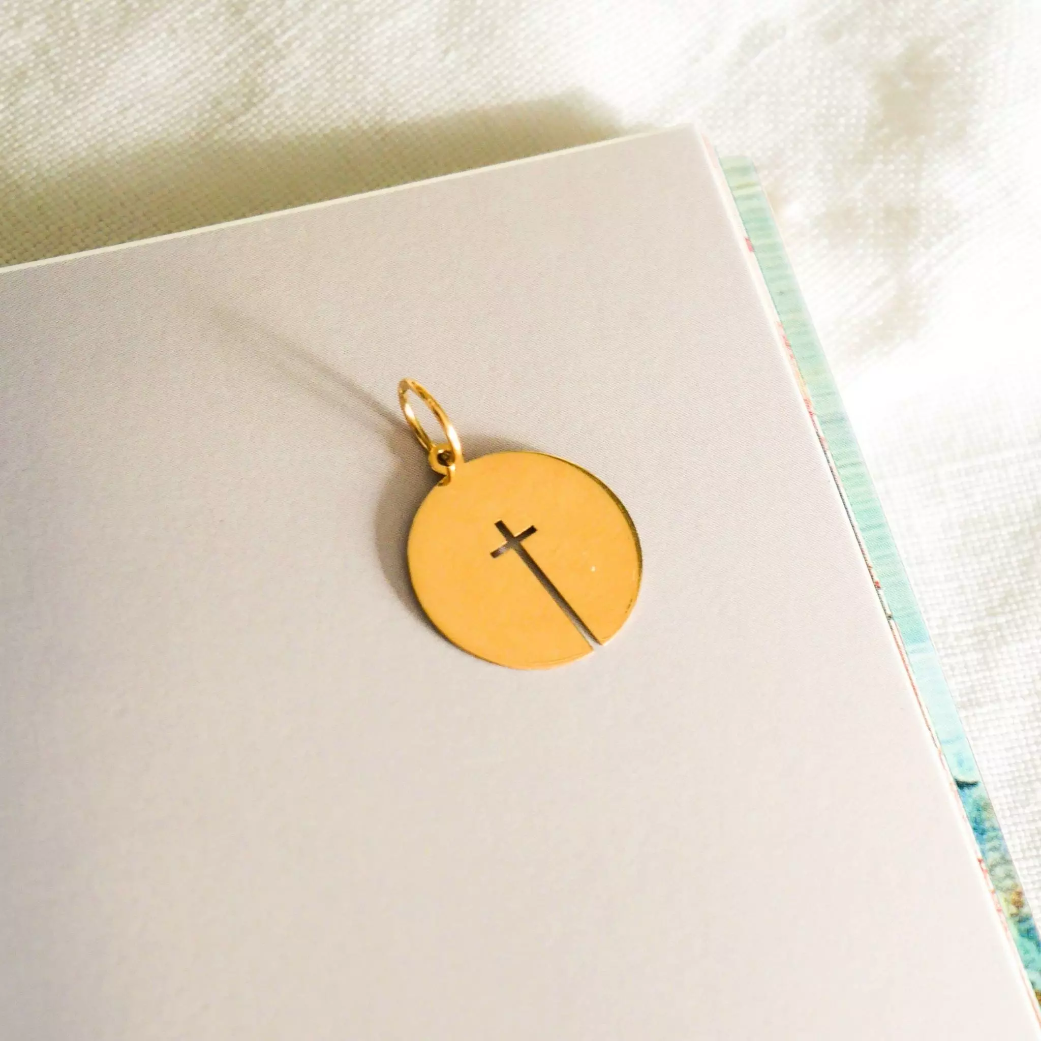 La médaille présente un jeton rond finement ajouré d’une croix latine, symbole universel de foi et de protection. Ce format plus grand offre un rendu plus visible et plus affirmé, tout en conservant la sobriété des lignes et la légèreté de l’ajourage.