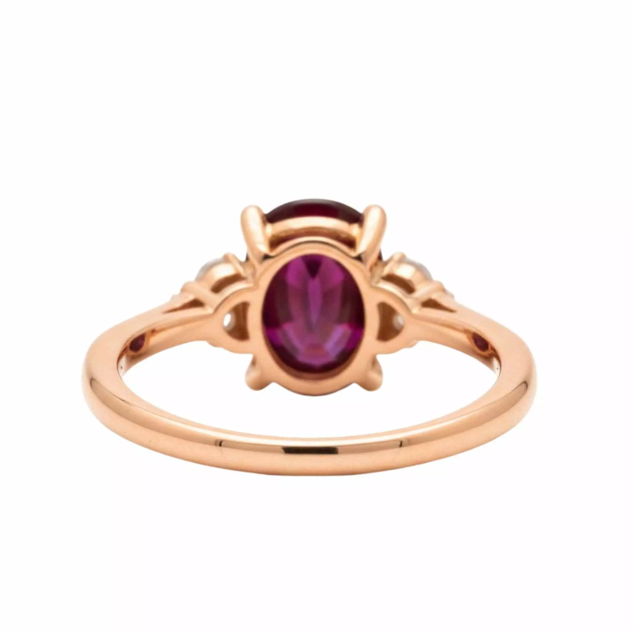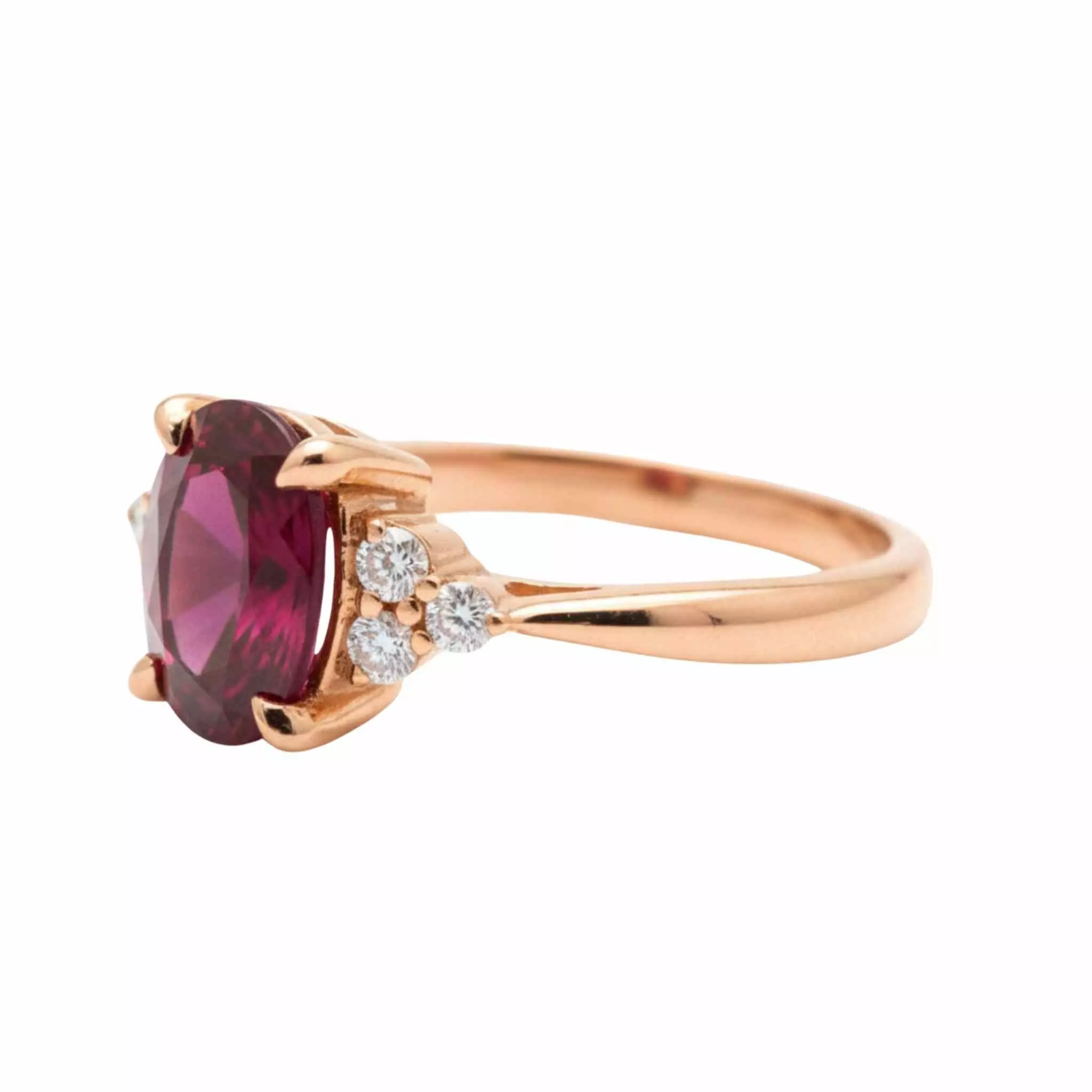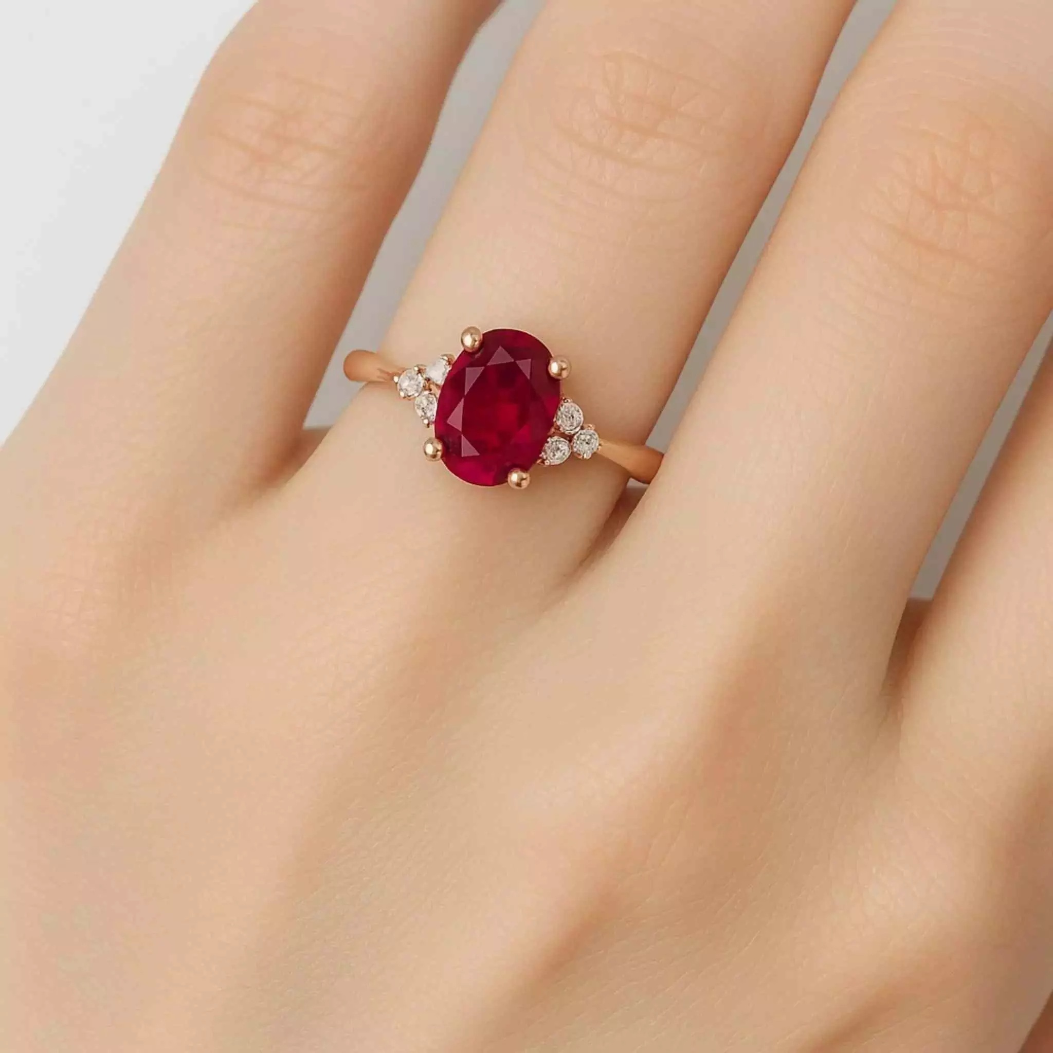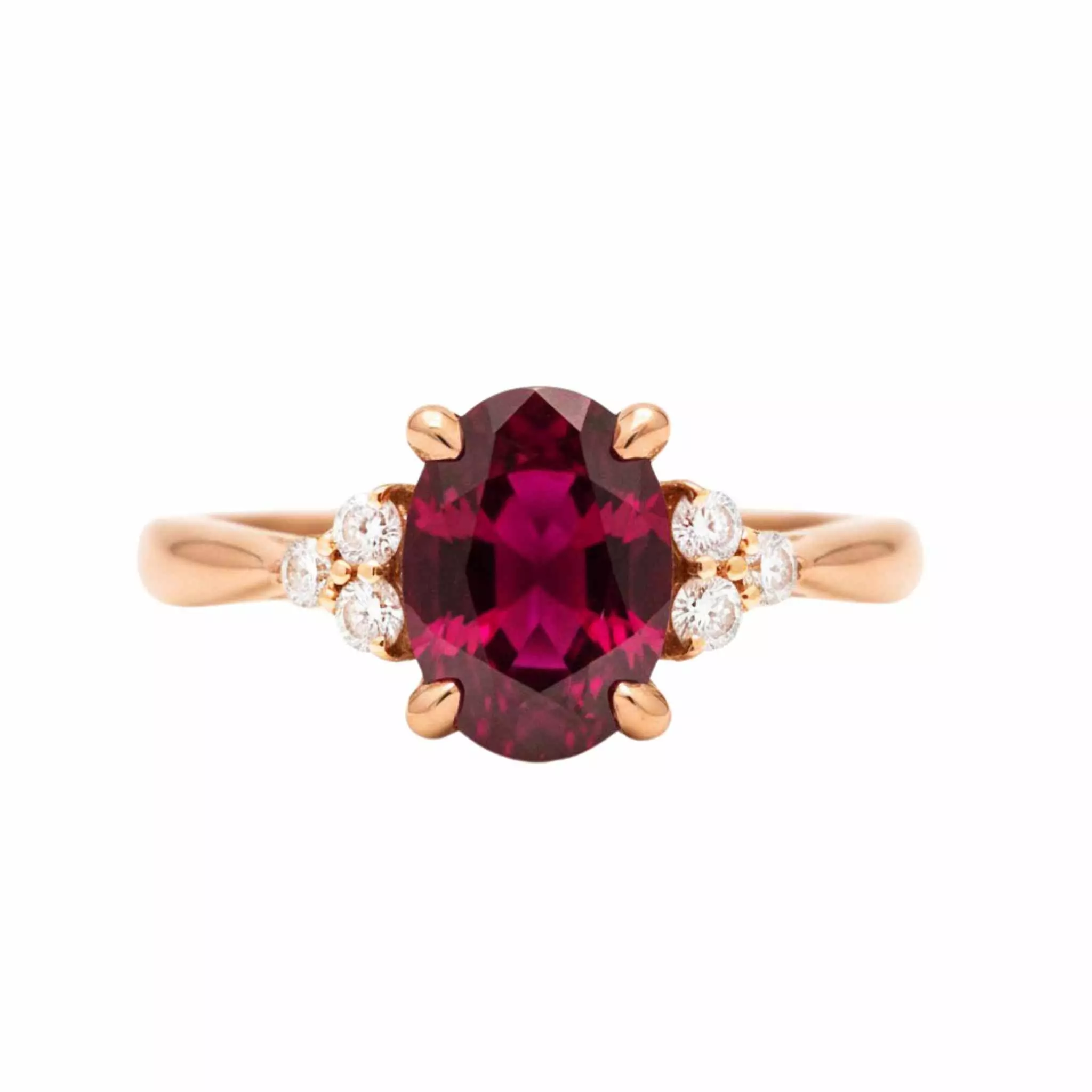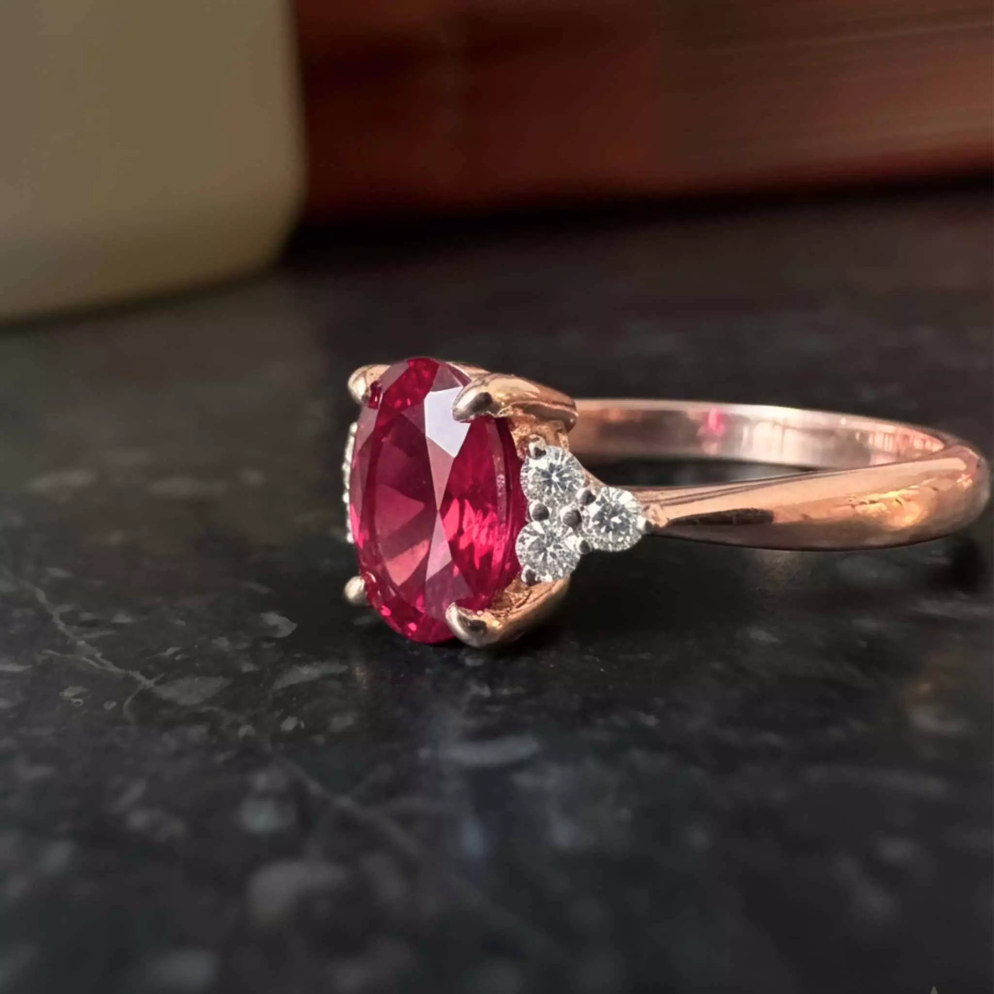 Cette bague pierre précieuse en or rose 18 carats met en valeur un rubis ovale naturel de 1.02 carat (8 × 6 mm), dont le rouge intense et lumineux attire immédiatement le regard. La pierre centrale est maintenue par quatre griffes en or rose, assurant sécurité et élégance, tout en laissant passer la lumière pour révéler la profondeur et la chaleur du rubis.