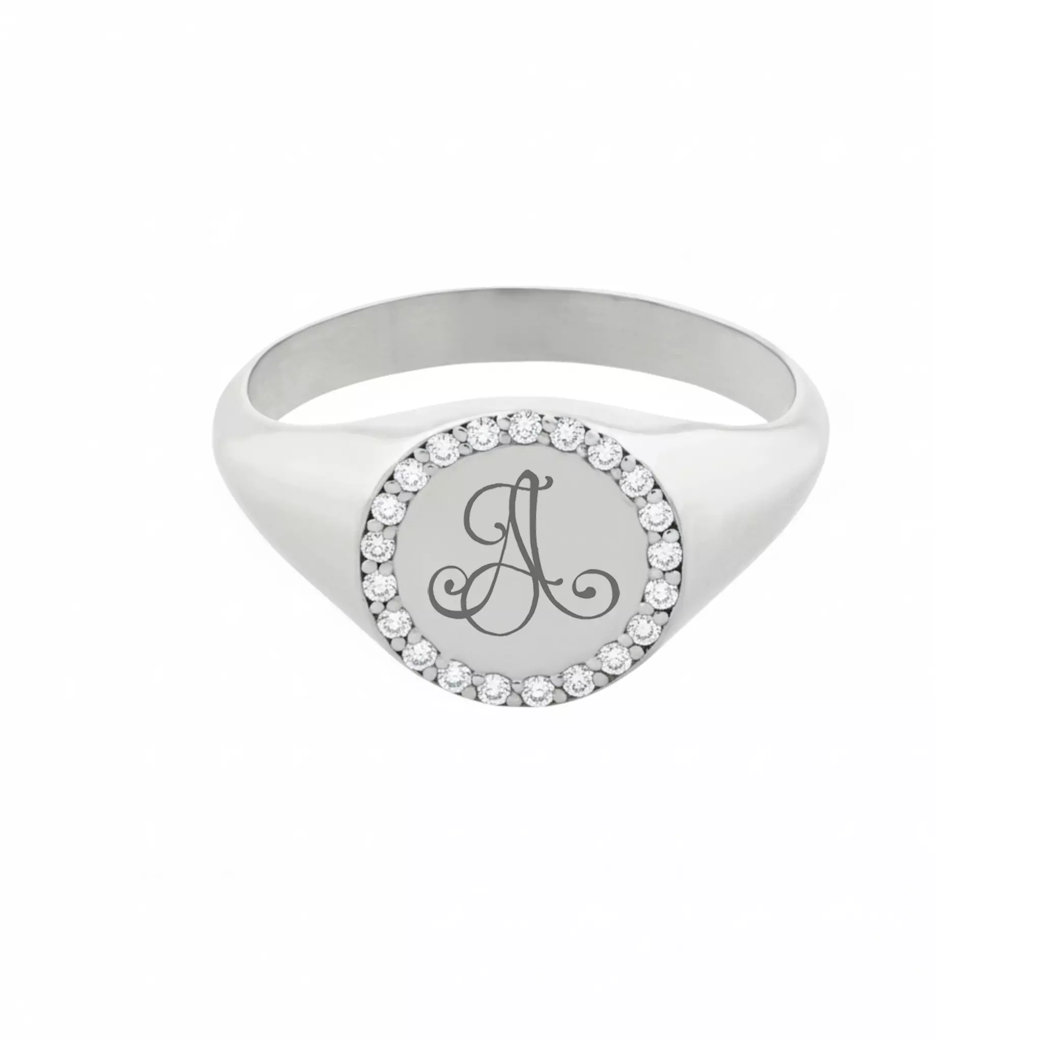 Au centre du plateau, vous pouvez personnaliser votre chevalière en y ajoutant une initiale gravée au laser. Chaque lettre peut être choisie parmi notre alphabet exclusif (voir photo), et il est également possible de commander une personnalisation plus complexe (initiales entrelacées) sur devis.
