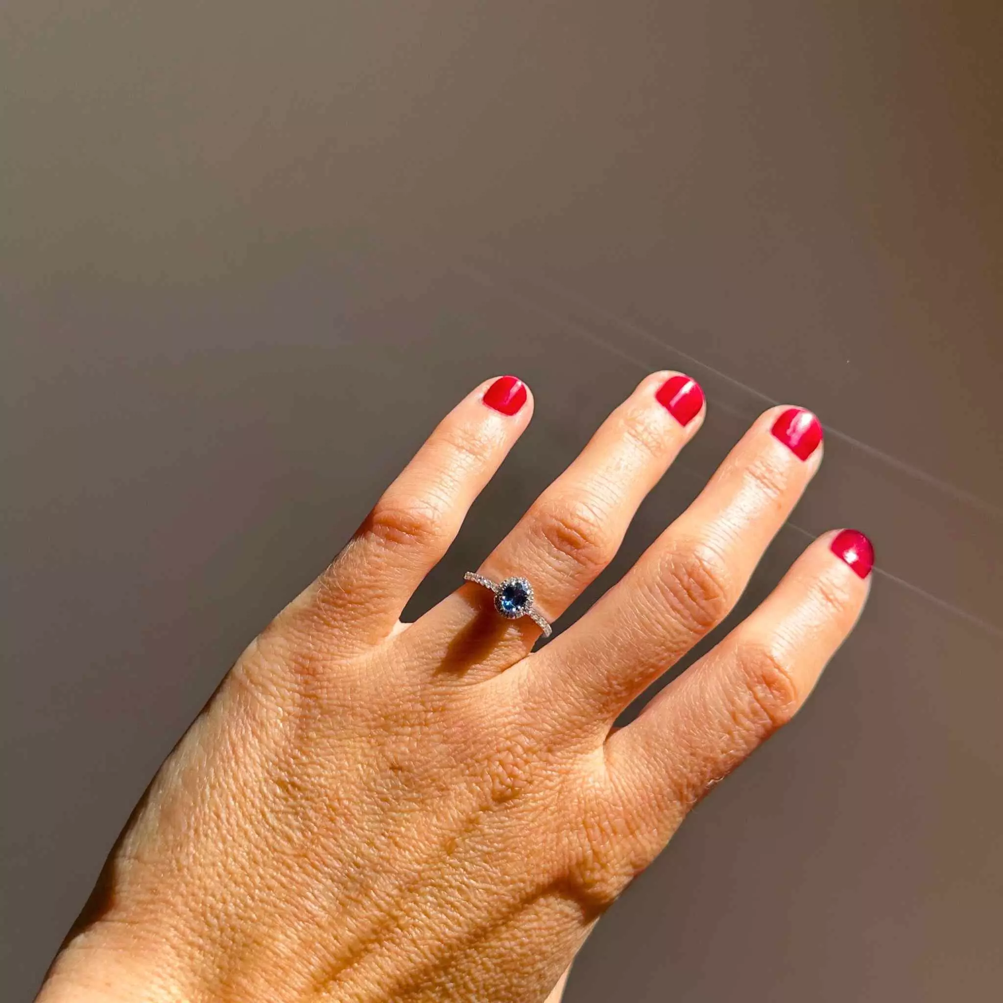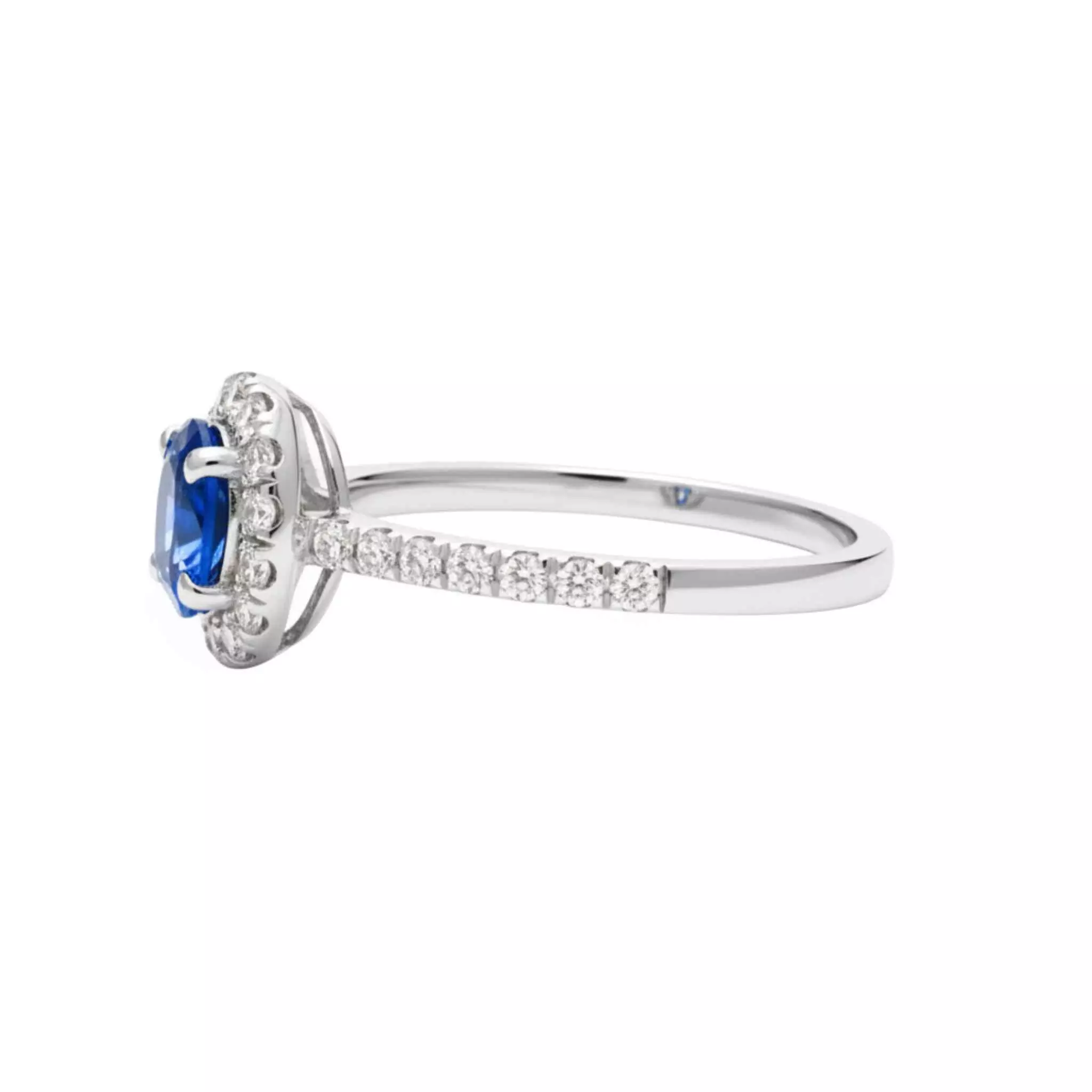 Élégante et intemporelle, cette bague met en lumière un saphir naturel bleu profond, taillé en ovale et sublimé par un halo étincelant de 14 diamants blancs. Son éclat raffiné est encore rehaussé par les diamants sertis sur le corps en or blanc 18 carats.