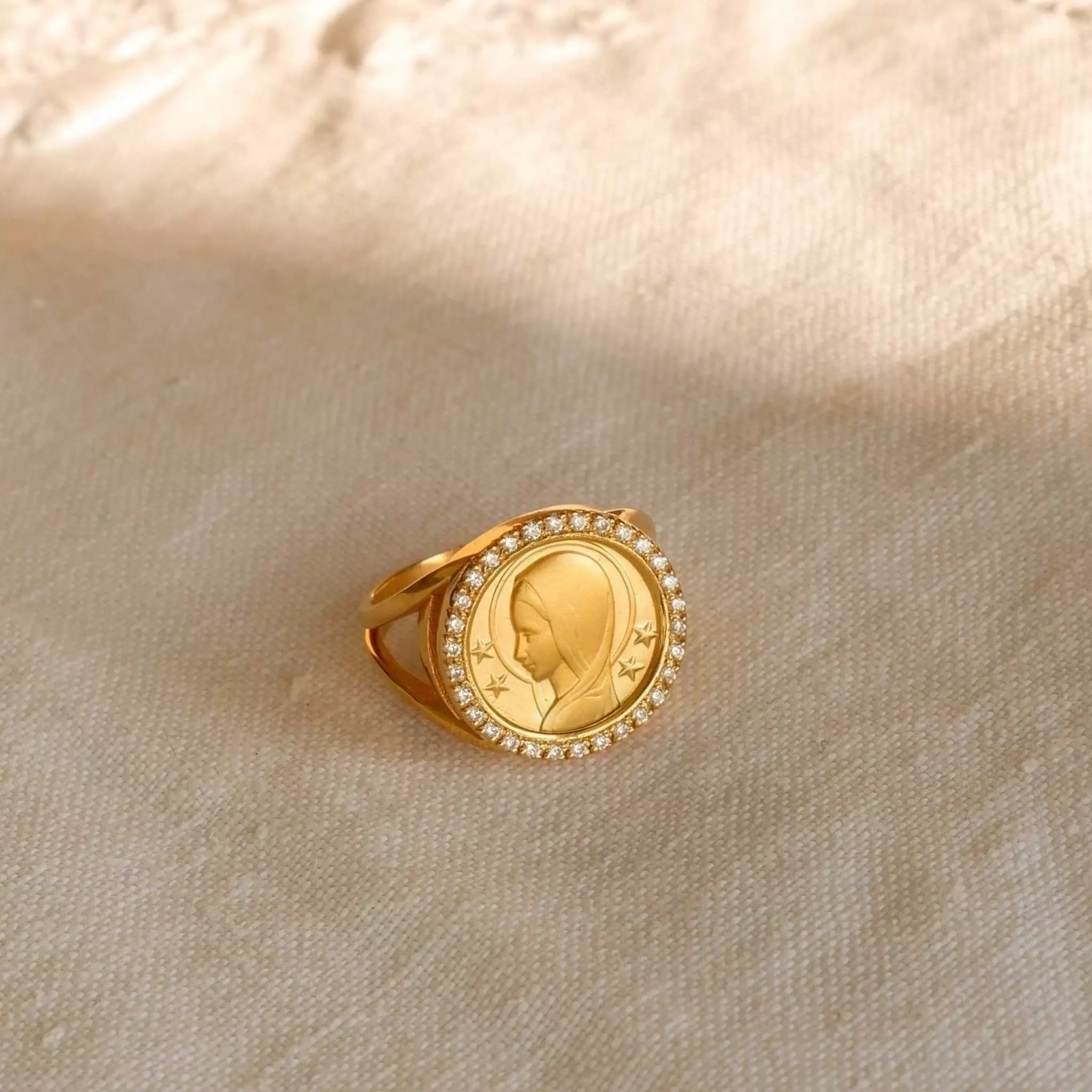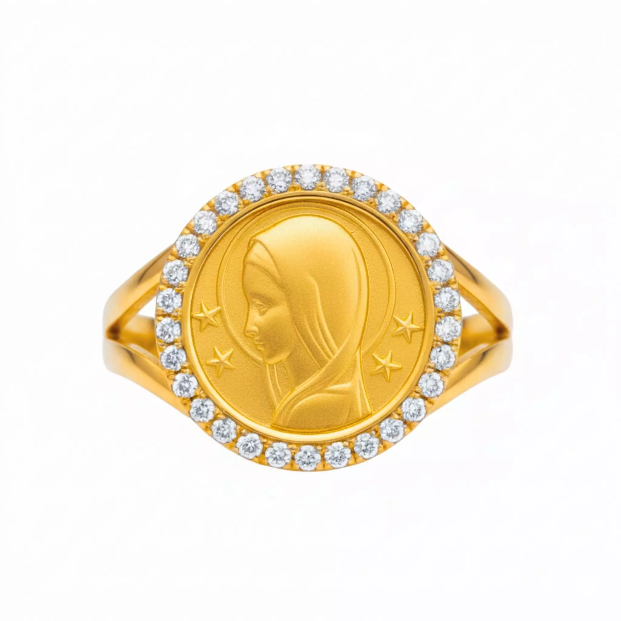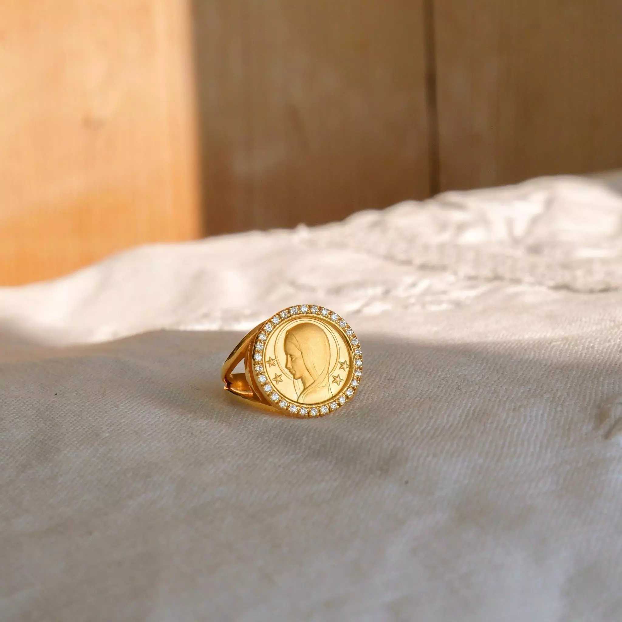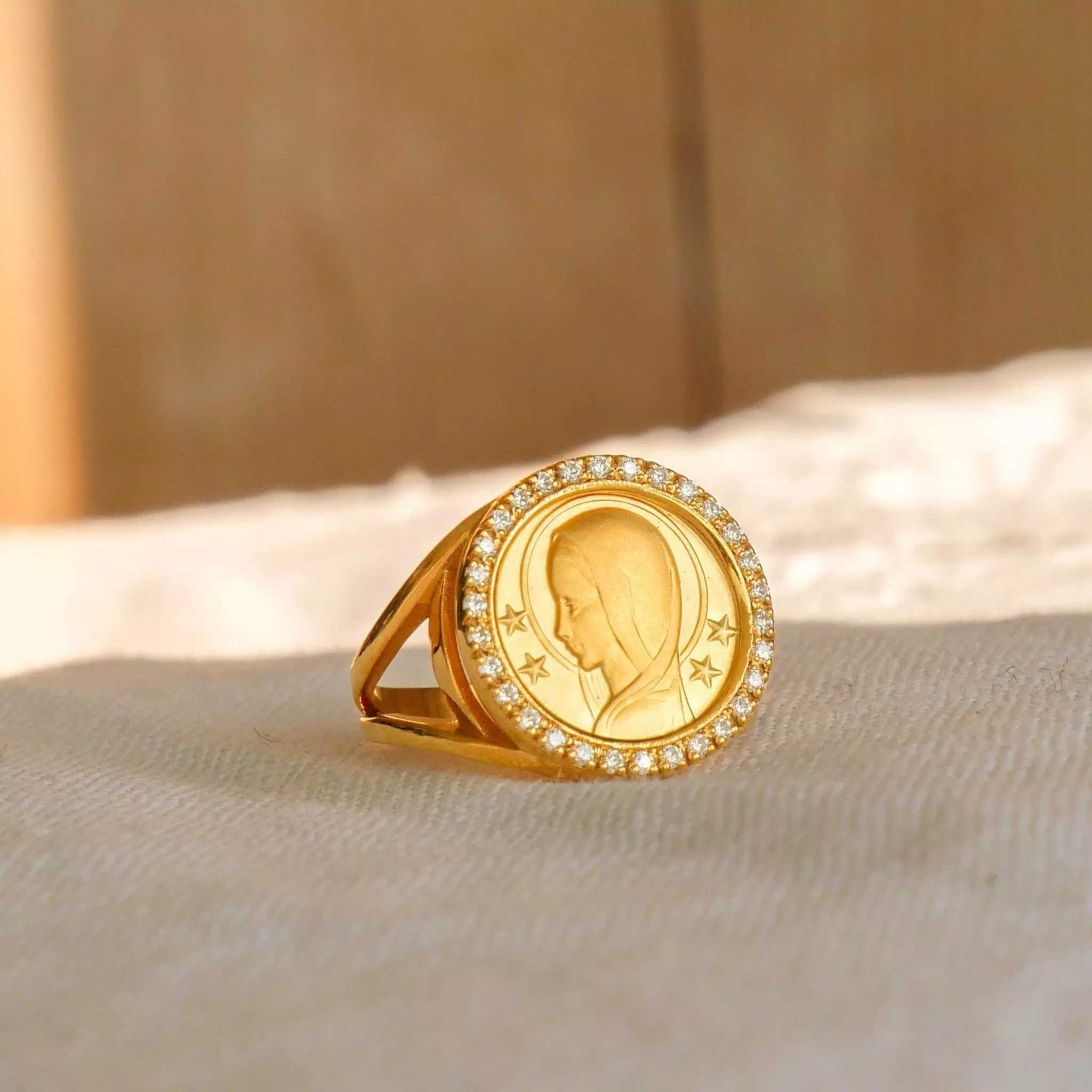 Cette élégante bague médaille en or 18 carats met à l'honneur la Vierge de profil, symbole de douceur et de protection. Son médaillon finement travaillé est sublimé par un délicat entourage de diamants, apportant éclat et raffinement à ce bijou d'exception.