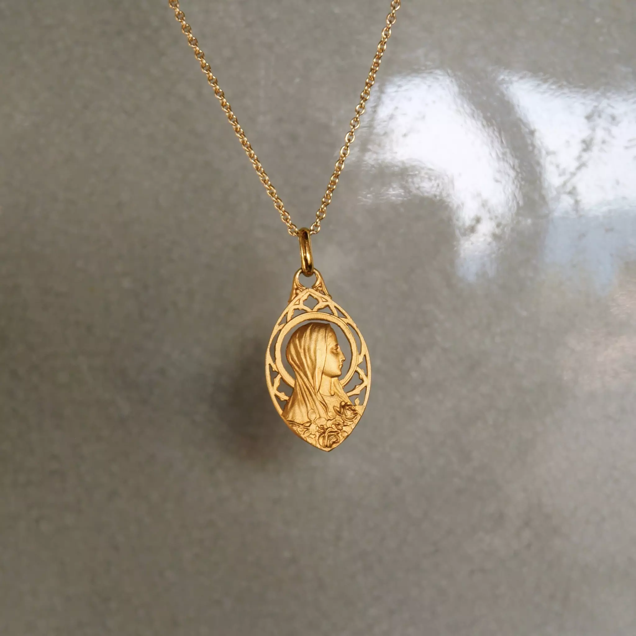 Découvrez ce pendentif médaille vierge ovale ajouré, inspiré des médailles anciennes. La Vierge de profil est mise en valeur par des ajours délicats qui apportent de la légèreté et de l'élégance à l'ensemble.