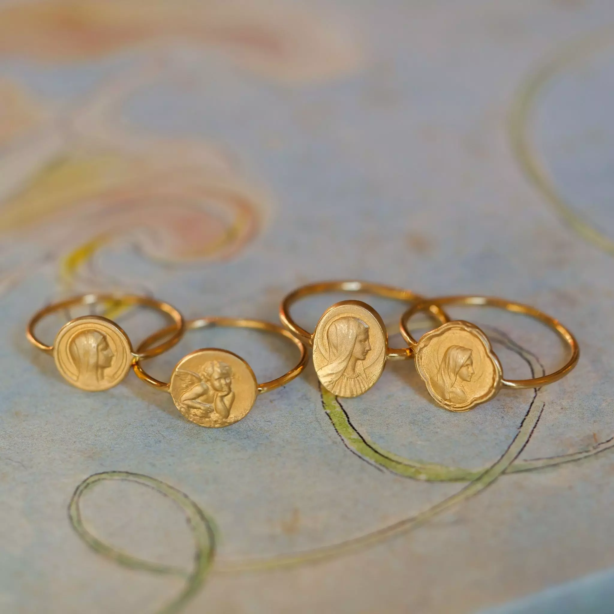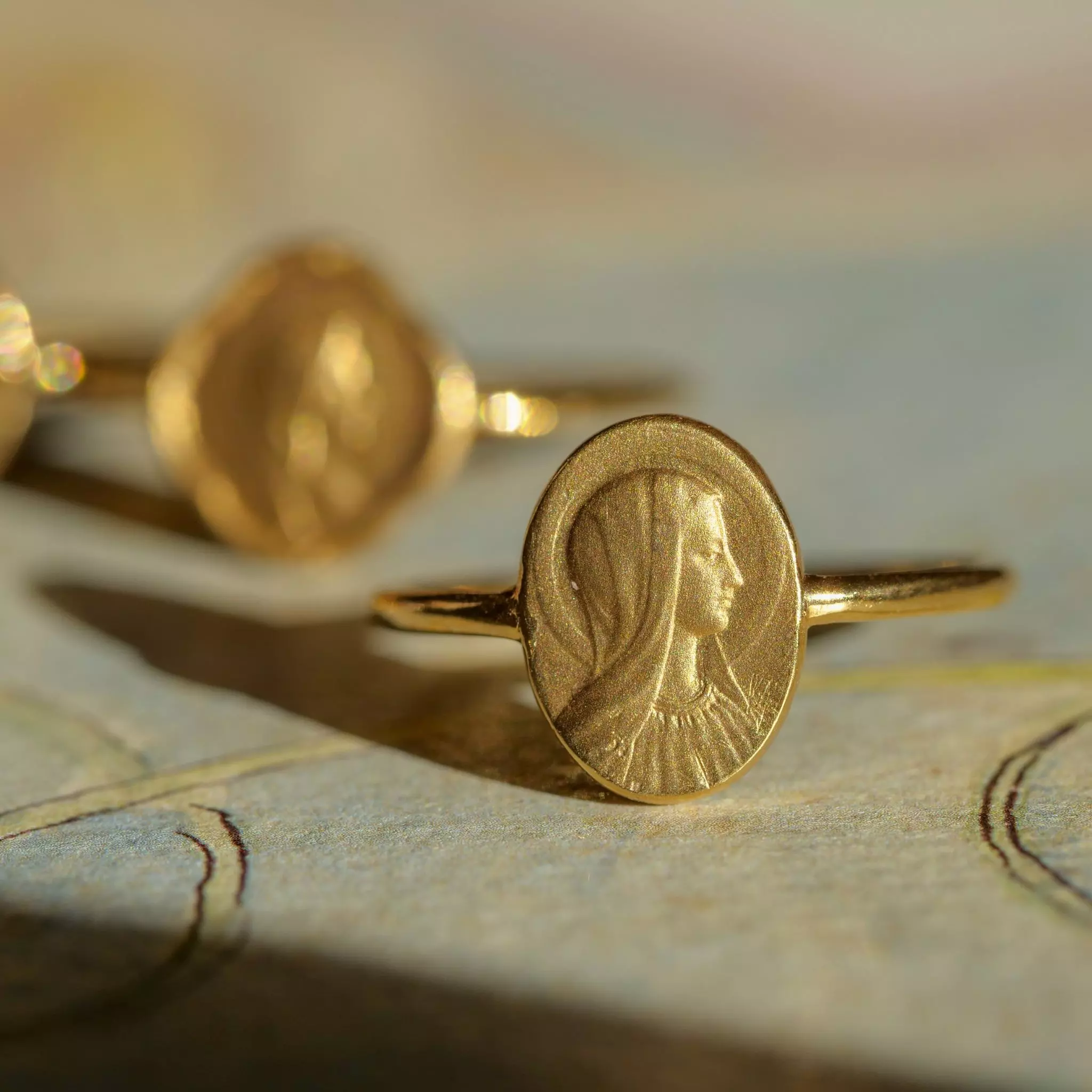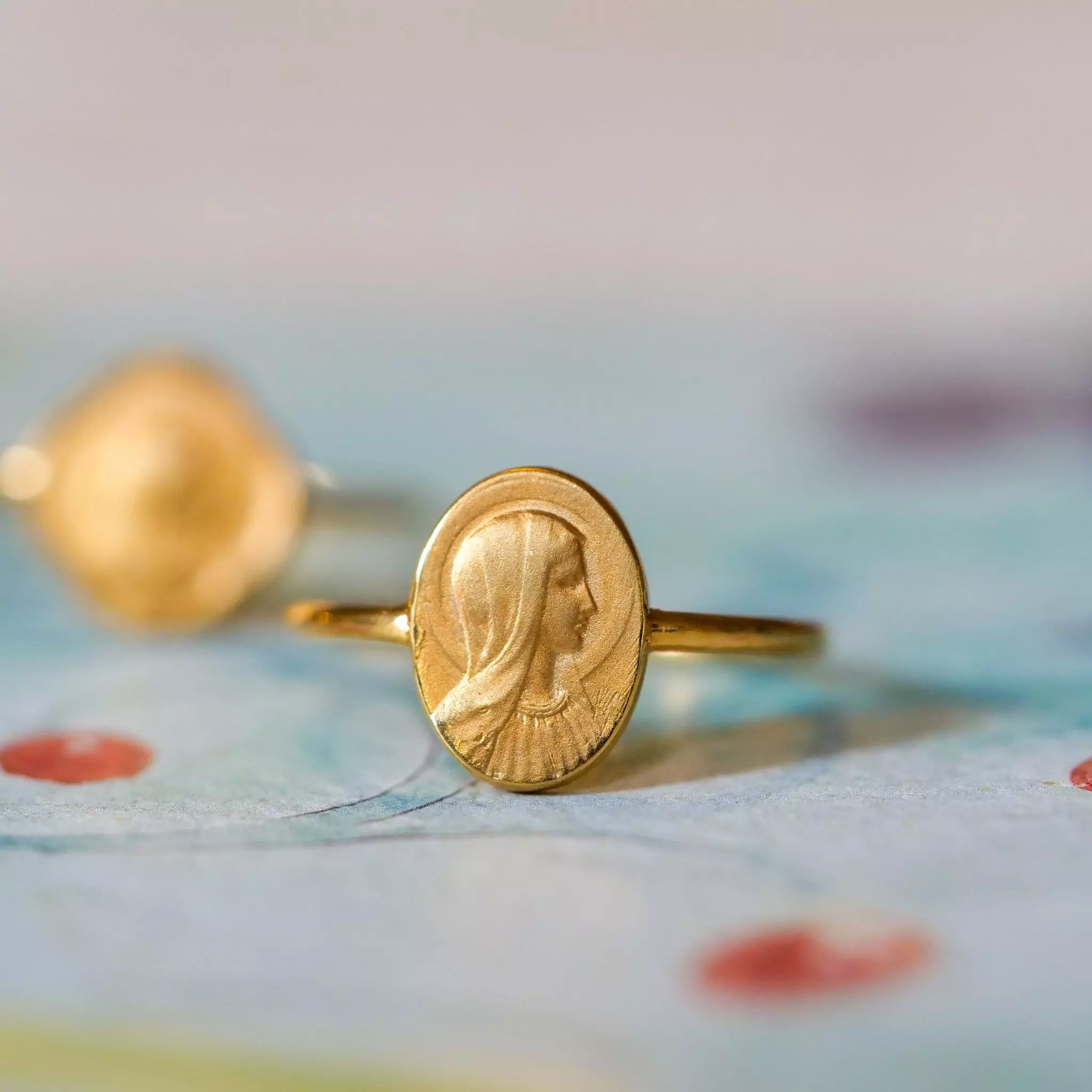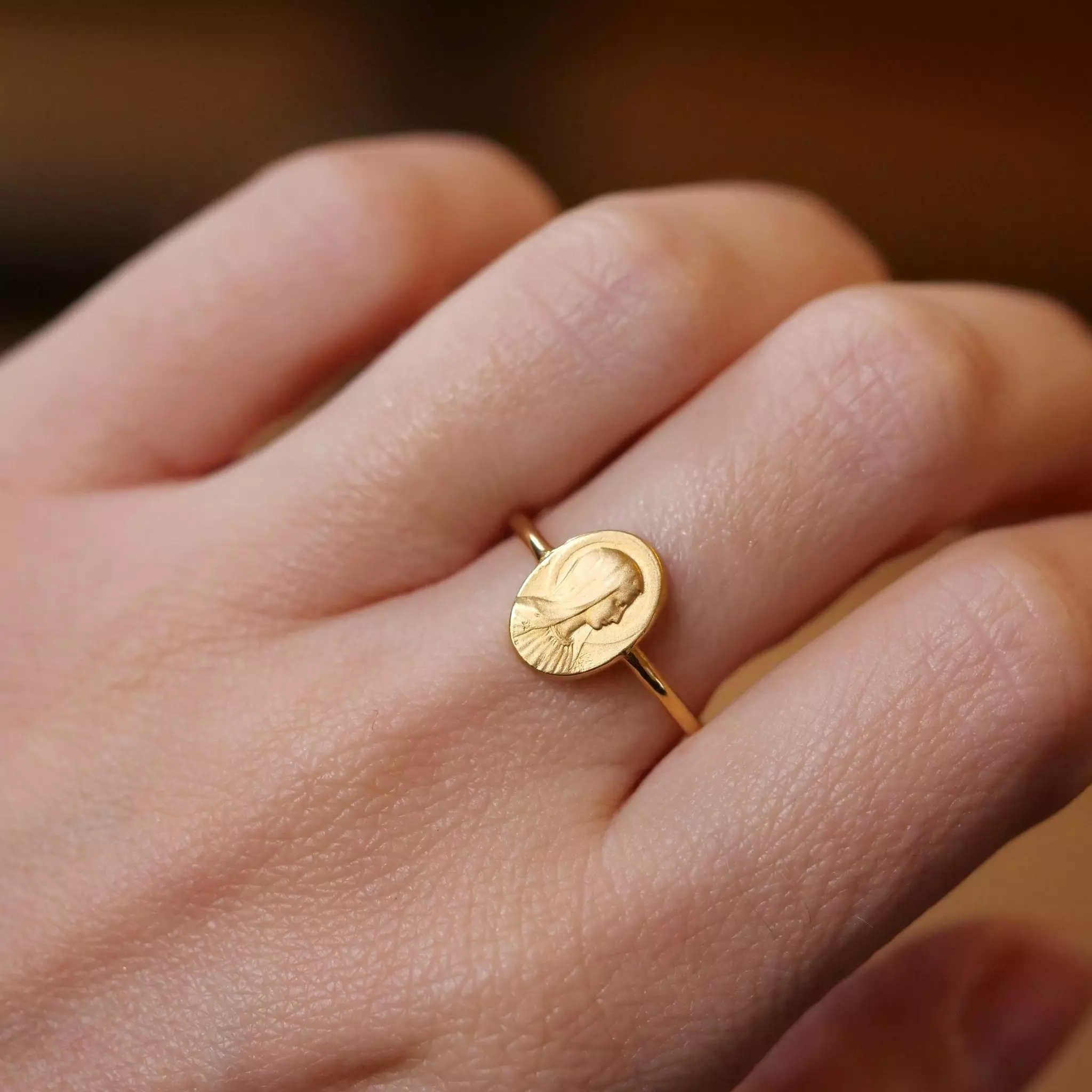 Découvrez cette bague médaille vierge, une création raffinée qui reprend la silhouette délicate de la Vierge de profil. Son médaillon ovale, travaillé avec précision, révèle une expression douce et apaisante, symbole de protection et de bienveillance.